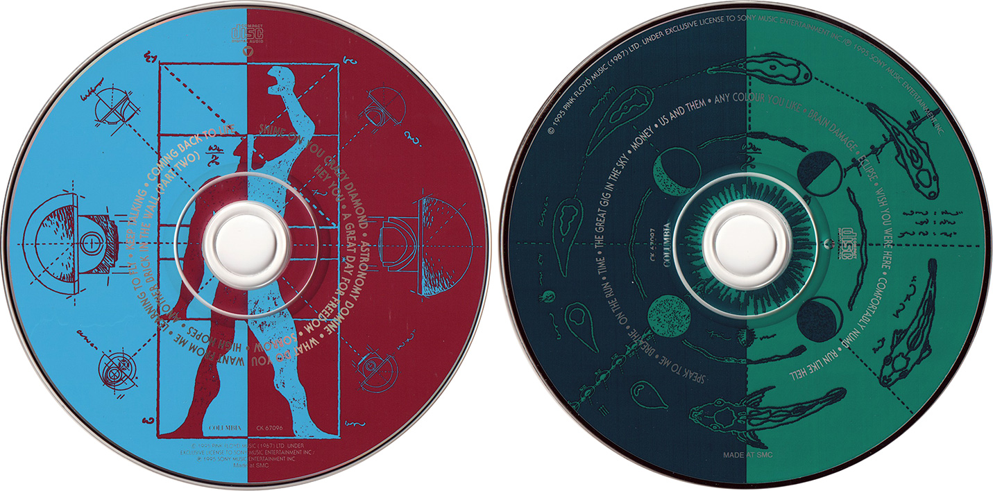 Back Cover: Two faces. Song titles. Bar code in upper right. At the bottom it says " 1994 Pink Floyd Music (1987) Ltd. Under exclusive license to Sony Music Entertainment Inc. / P 1994 Sony Music Entertainment Inc. / Manufactured and Distributed by / Fabrique et Distribu par Sony Music Entertainment (Canada) Inc., 1121 Leslie Street, North York, Ontario M3C 2J9. "Sony" is a trademark of Sony Corporation. Columbia is a trademark of Sony Music Entertainment (Canada) Inc. WARNING: All Rights Reserved. Unauthorized duplication is a violation of applicable laws."