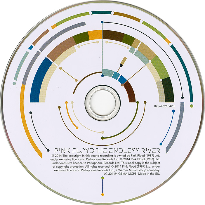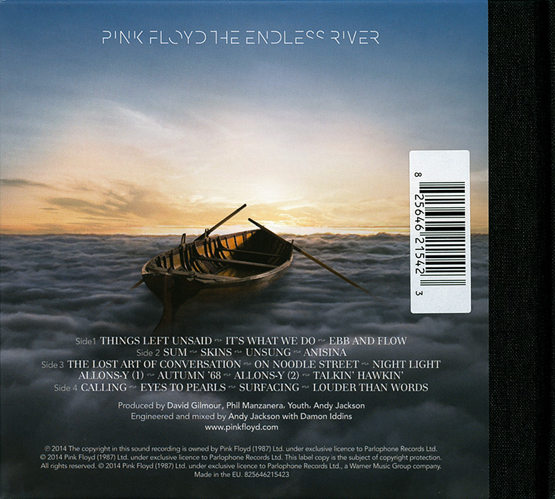 Cover Sticker: Rectangular white cover sticker that says "PINK FLOYD THE ENDLESS RIVER Deluxe 2-Disc Set CD + DVD includes Album 5.1 mix and Stereo, Plus non-album material (39 mins approx), 6 video tracks + 3 audio tracks, 24-page deluxe hardback booklet, 3 collectors' postcards, Stereo PCM, 5.1 Dolby Digital and 5.1 DTS, All audio in 48kHz/24 bit, Archive video material from standard definition source. 825646213344"