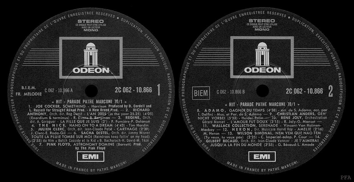 Release Information: A sampler that features the Pink Floyd song, Astronomy Domine. Also includes Joe Cocker, Richard Anthony, Régine, The Nice, Julien Clerc , Sacha Distel, Adamo, Christian Anders, René Joly, Wallace Collection, Héron, Wilson Simonal, and Gilbert Bécaud.