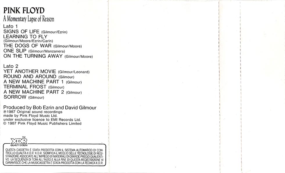 Cover: Blue with "Pink Floyd" in yellow on the top and the title of the album in black, and a picture of the band with David Gilmour, in front of Kew Gardens. Bar code on back. Song listing on the inside. "Made in Italy" under the song listing.