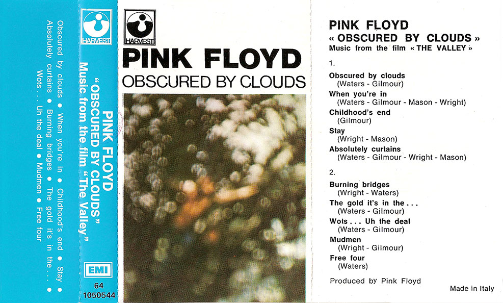 Cover (tape 1) Blue background with "Pink Floyd" and the album title in white text. Receding pictures of band members. EMI / Harvest logos. Blue spine, white back. Bar code. "Made in Italy by EMI Italiana SpA" under the bar code. Song listing on the back.