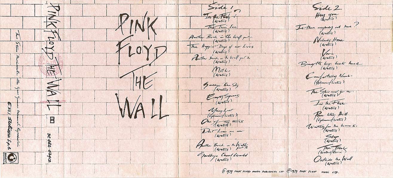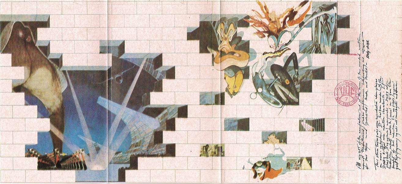 Cover: White brick wall with title. Scarfe's drawings on inside.