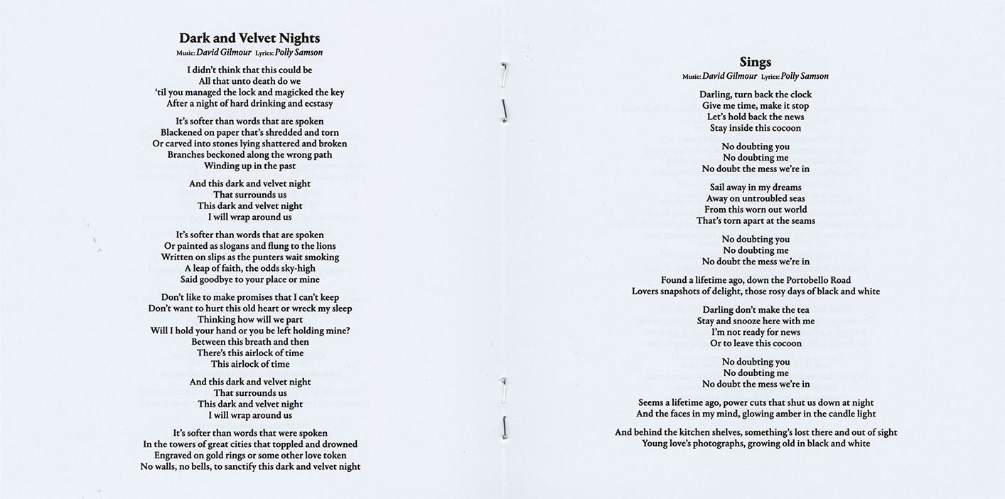 Back Cover: A picture of David Gilmour. Song titles. Credits.
