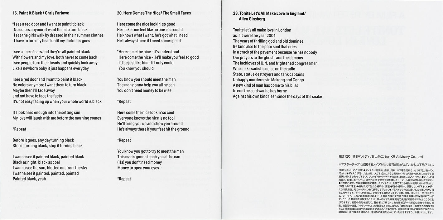 Insert: 20-page booklet with song listing, lyrics and information about each song in Japanese and English.