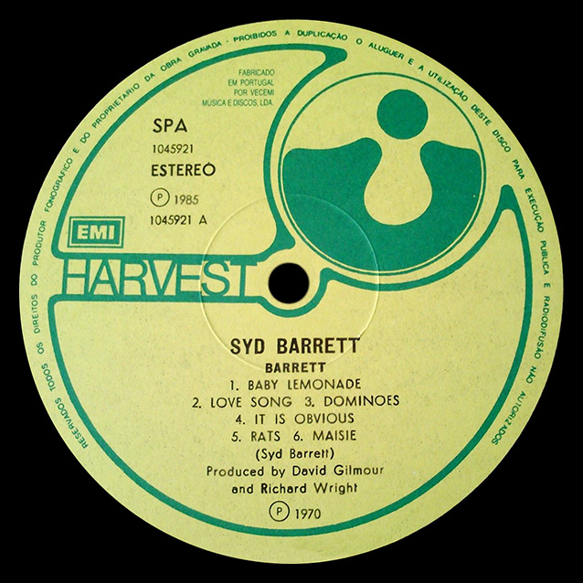 Cover: A picture of Syd Barett. Harvest logo in upper left corner.