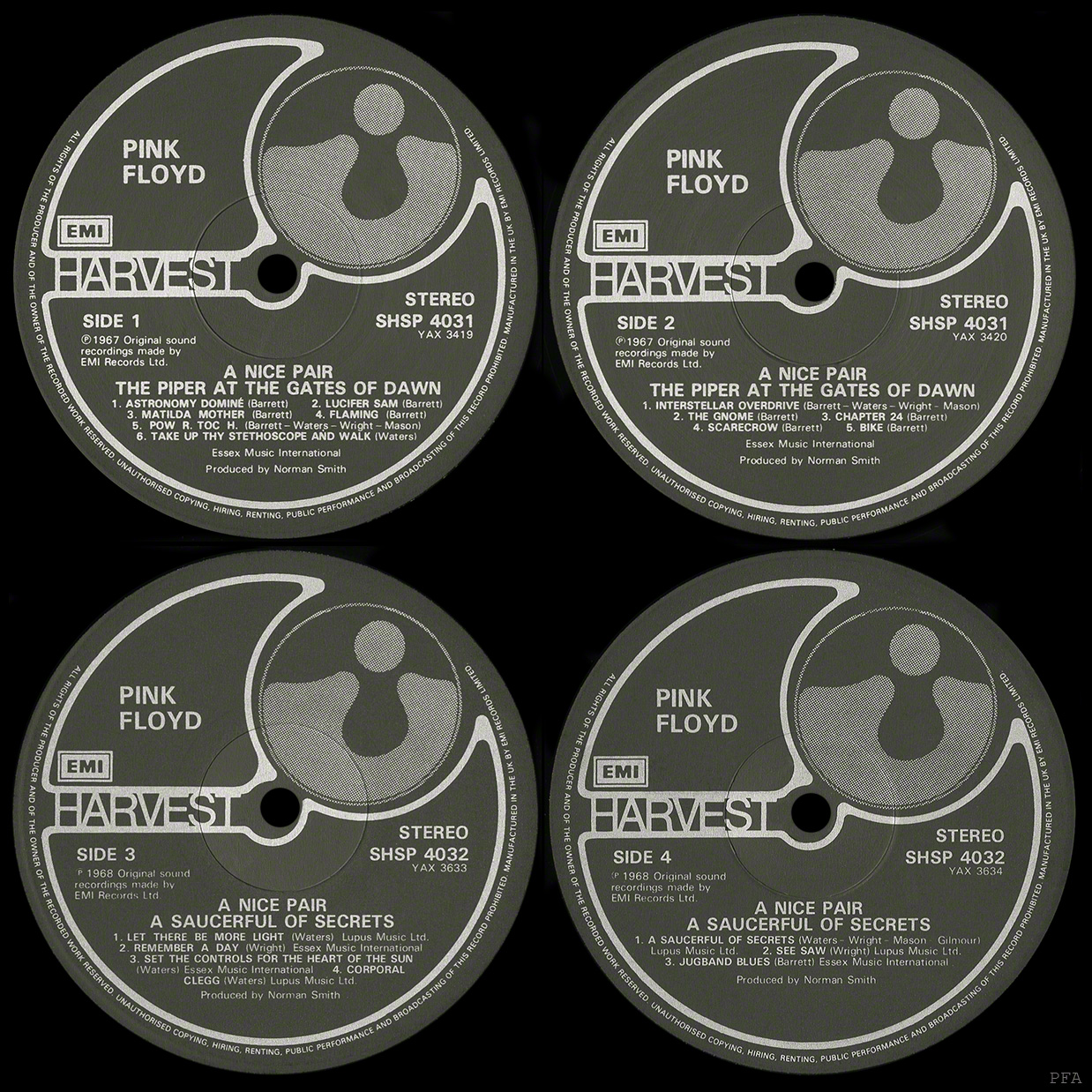 Inner Sleeves: [1 - front] [1 - back] [2 - front] [2 - back] Issued with one blue, and one green inner sleeve that have the cover picture from The Piper at the Gates of Dawn album on one side, and the cover picture from A Saucerful of Secrets album on the other side. At the top left corner is the EMI logo. Matte.