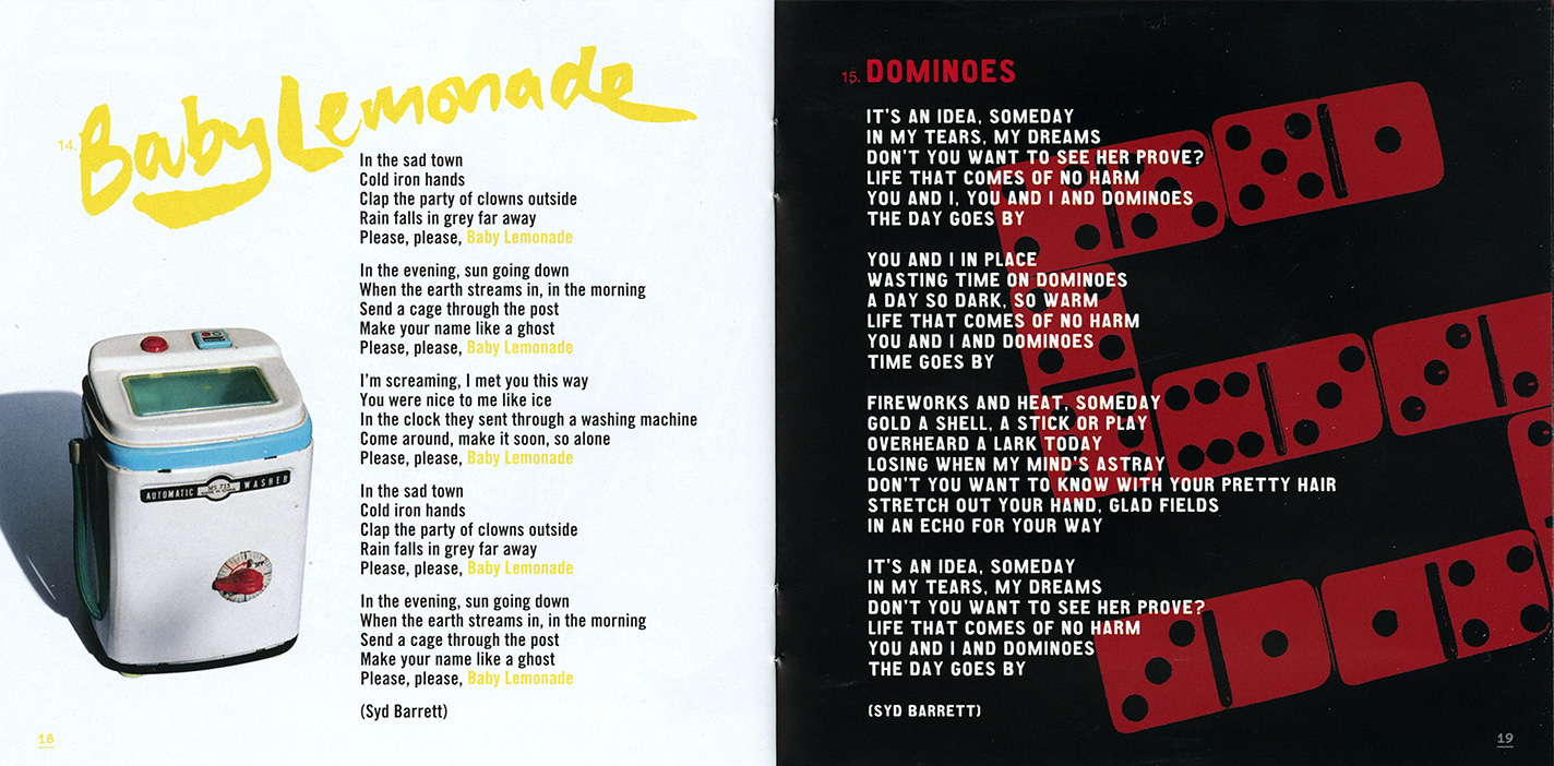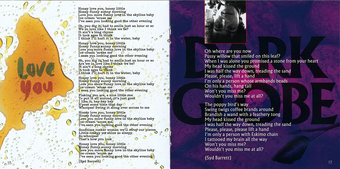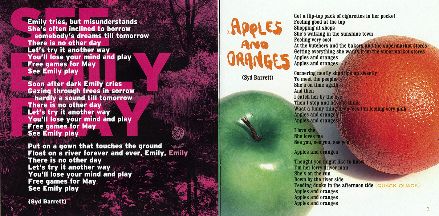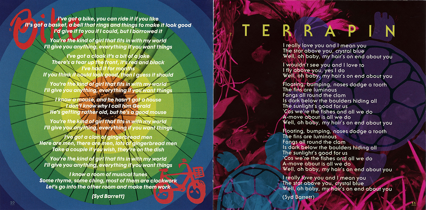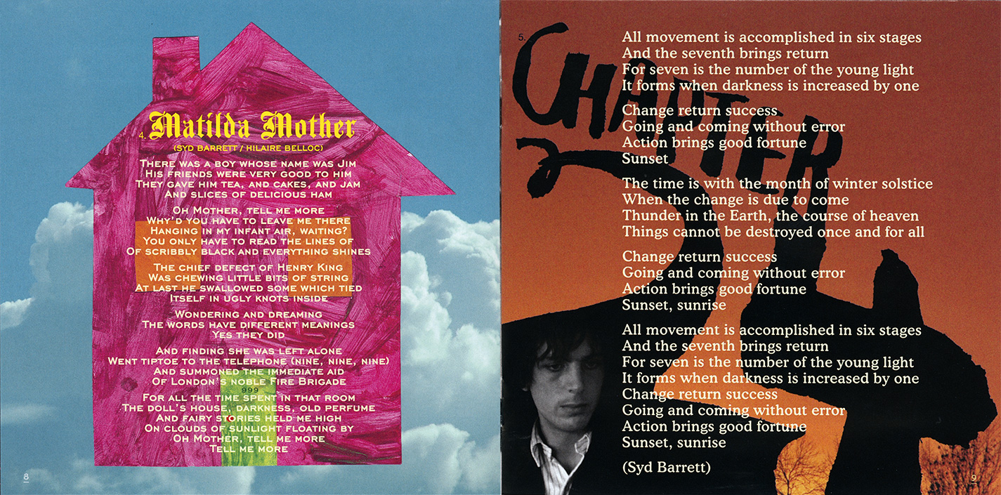 Front Cover: A picture of Syd Barrett. Title. Eight-page booklet.