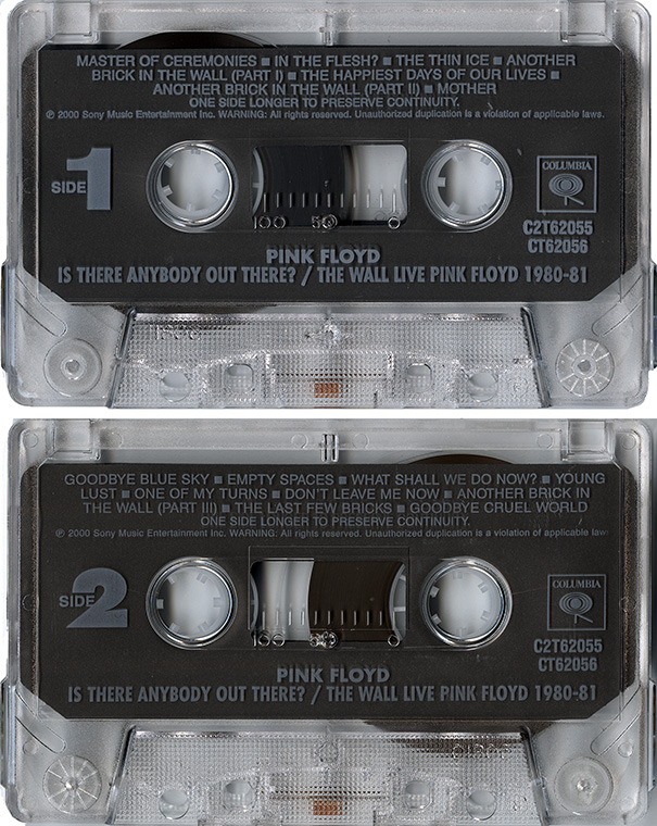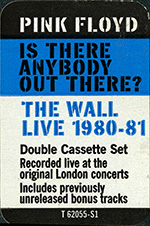 Cover Sticker: Issued with a blue / white cover sticker that says "PINK FLOYD, Is There Anybody Out There, The Wall Live 1980-81, Double Cassette Set, Recorded live at the original London concerts, Includes previously unreleased bonus tracks, T 62055-S1."
