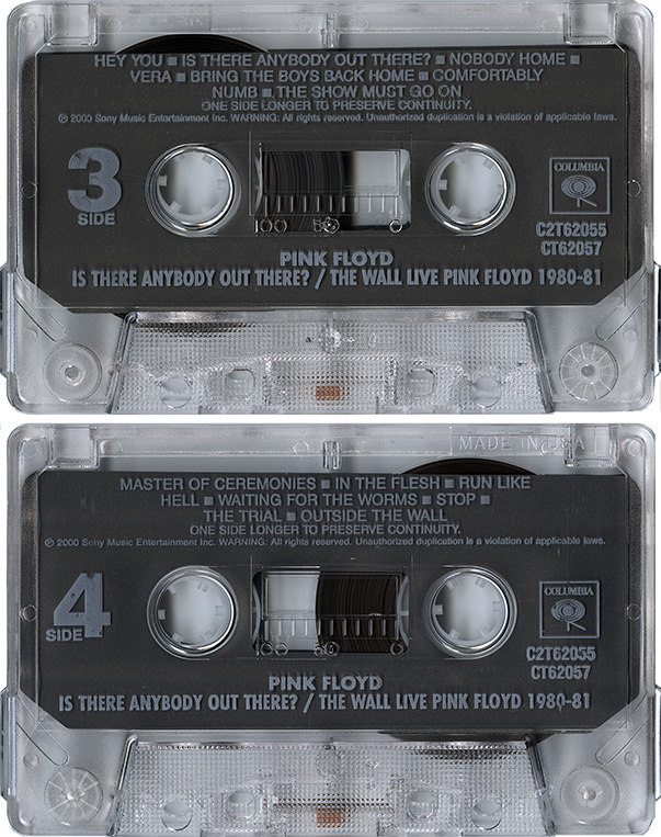 Cover Sticker: Issued with a blue / white cover sticker that says "PINK FLOYD, Is There Anybody Out There, The Wall Live 1980-81, Double Cassette Set, Recorded live at the original Earls Court, London performances, Includes previously unreleased bonus tracks, Never-before-available hi-resolution mix from the original multi-track concert recordings, T 62059-S1."