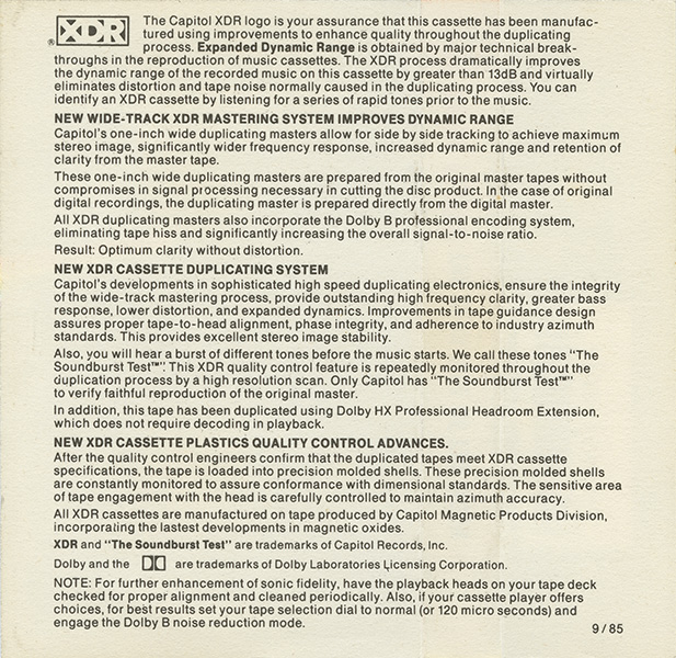 Release Information: 1994 Capitol Records remastered and repackaged cassette with lyrics and photos in booklet.
