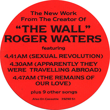 Release Information: U.S. orange vinyl issue. Made in Germany. The orange vinyl issue was available directly from Roger Waters' web site (www.rogerwaters.com).