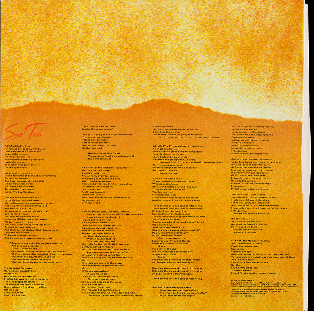 Back Cover: Song listing. Picture of Roger Waters playing a piano. Credits. Bar code.