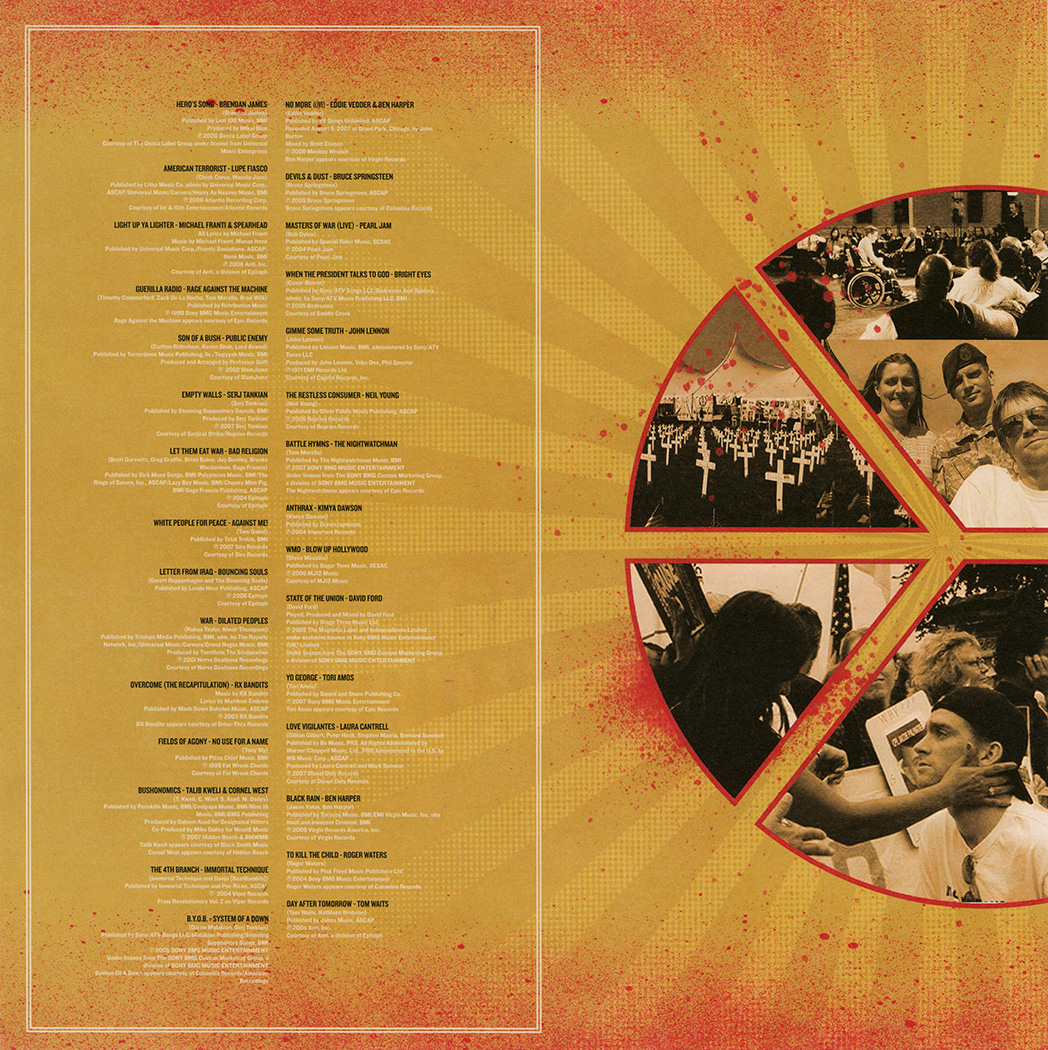 Side 2: Serj Tankian-Empty Walls, Bad Religion-Let Them Eat War, Against Me!-White People For Peace, Bouncing Souls-Letter From Iraq, Dilated Peoples-War, Rx Bandits-Overcome (the recapitulations).