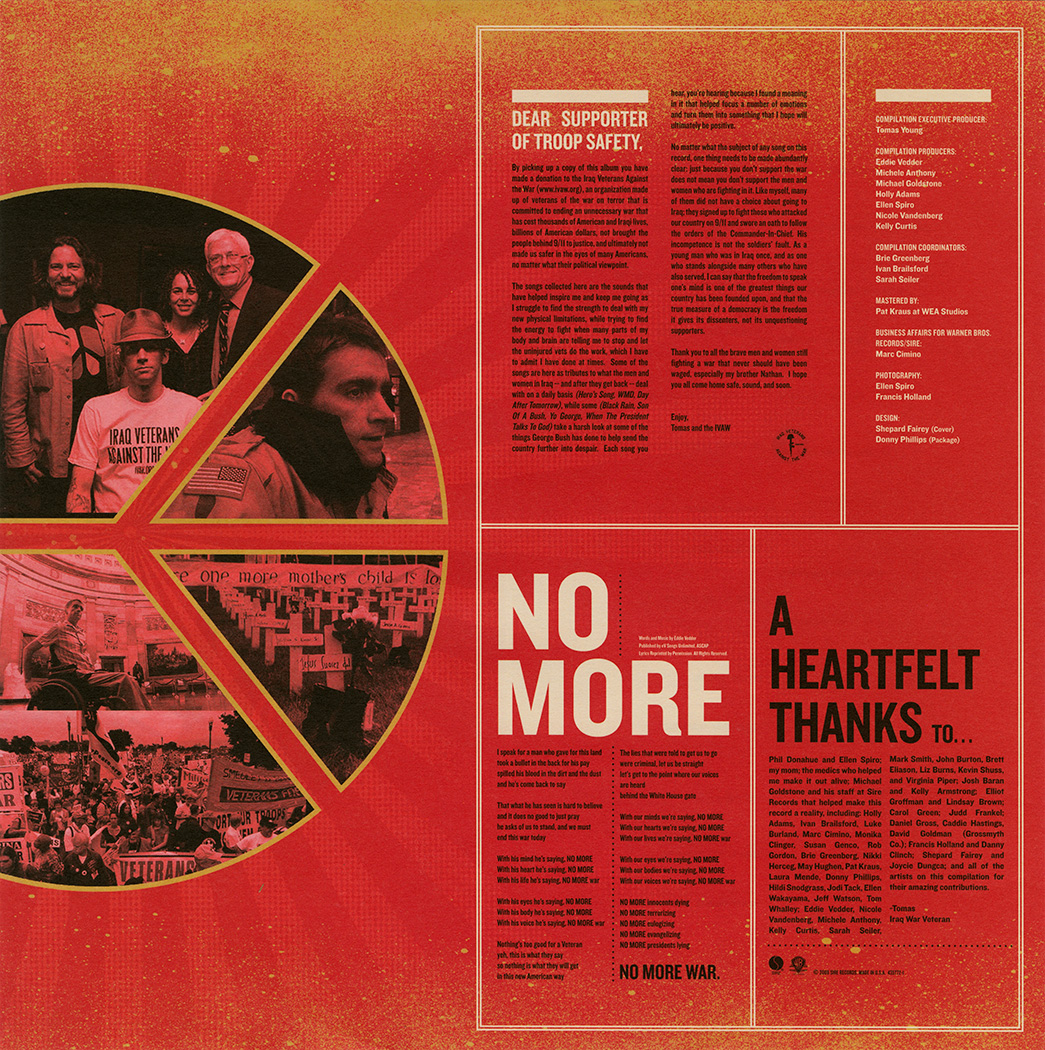Cover Sticker: Square sticker with peace sign that says "This compilation was curated by Iraq War Veteran Thomas Young. Featuring the previously unreleased Eddie Vedder song "No More" (live with Ben Harper) & politically charged tracks from John Lennon, Neil Young, Ben Harper, Bright Eyes, Lupe Fiasco, Kimya Dawson & many more."