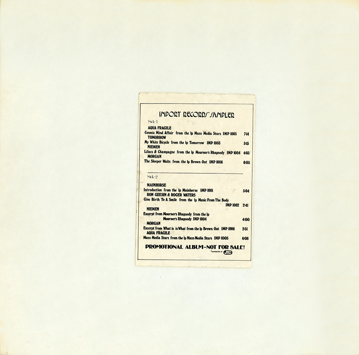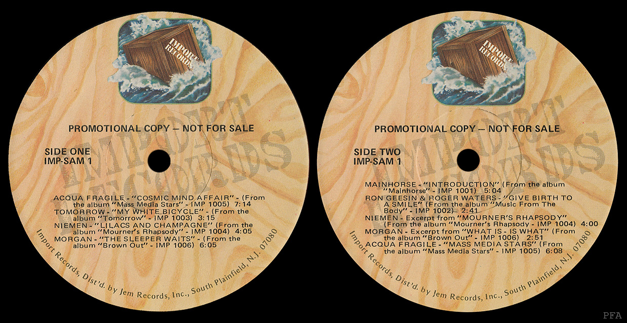 Release Information: A promotional only release. Artists include Aqua Fragile, Tomorrow, Niemen, Morgan, Mainhorse, and Ron Geesin & Roger Waters.