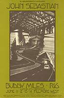 BG 237-1 - John Sebastian / Buddy Miles / RIG, June 11-14, 1970, the back of this card has an upcoming calendar of events for the Fillmore West, and the Oakland Coliseum, with dates listed for Sha Na Na / Pacific Gas & Electric / Crosby Stills Nash & Young / Traffic, (BG 238-1) (art by David Singer), A, $35