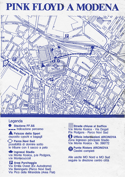 Notes: A flyer for the Pink Floyd concerts at the Stadio Comunale A. Braglia in Modena, Italy on July 8-9, 1988.