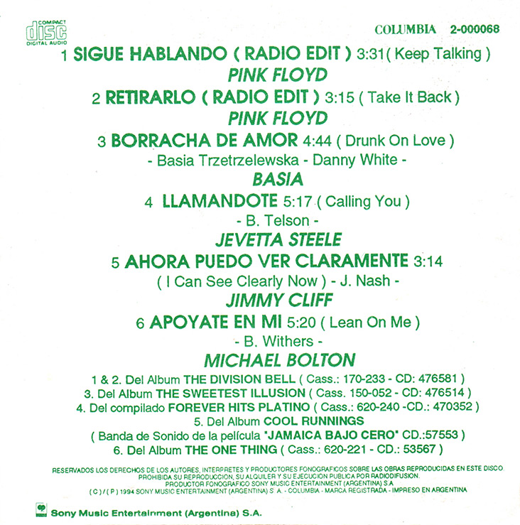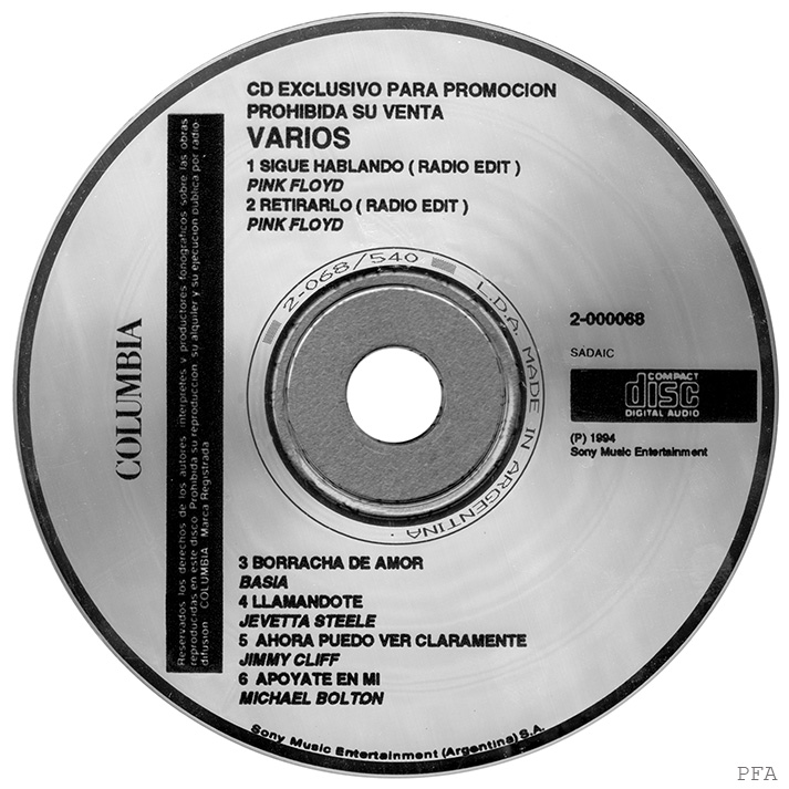 Release Information: Argentinean promotional CD that contains the Pink Floyd songs, Keep Talking (radio edit), and Take It Back (radio edit). Also contains songs by Basia, Jevetta Steele, Jimmy Cliff, and Michael Bolton.
