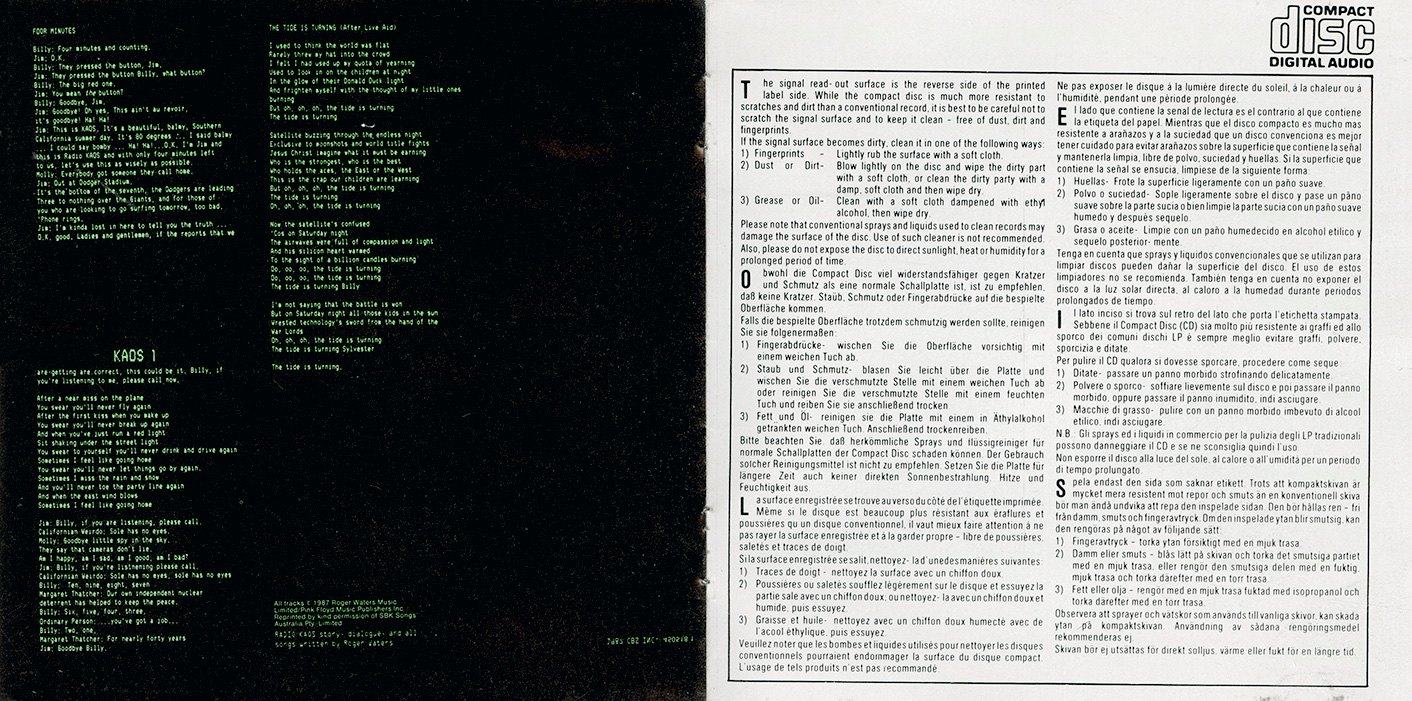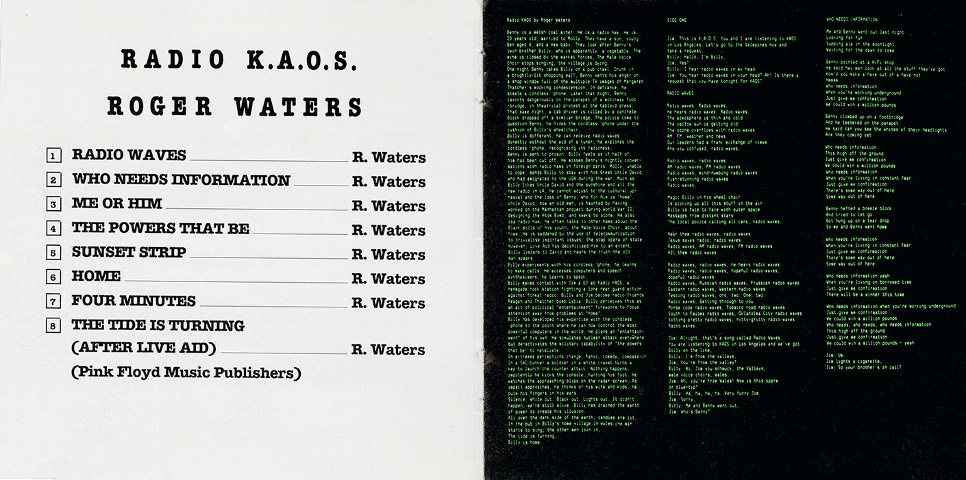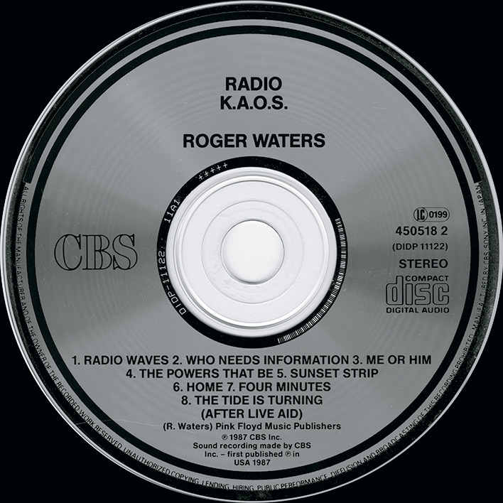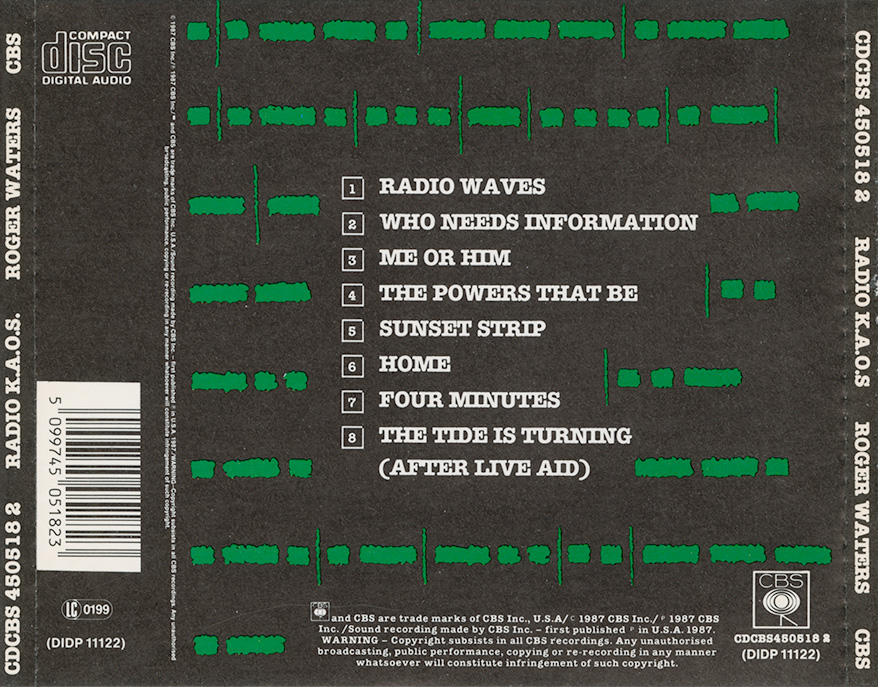 Cover Sticker: Some copies have a white rectangular sticker on the front that says: ROGER WATERS "Radio KAOS." features the single "Radio Waves."