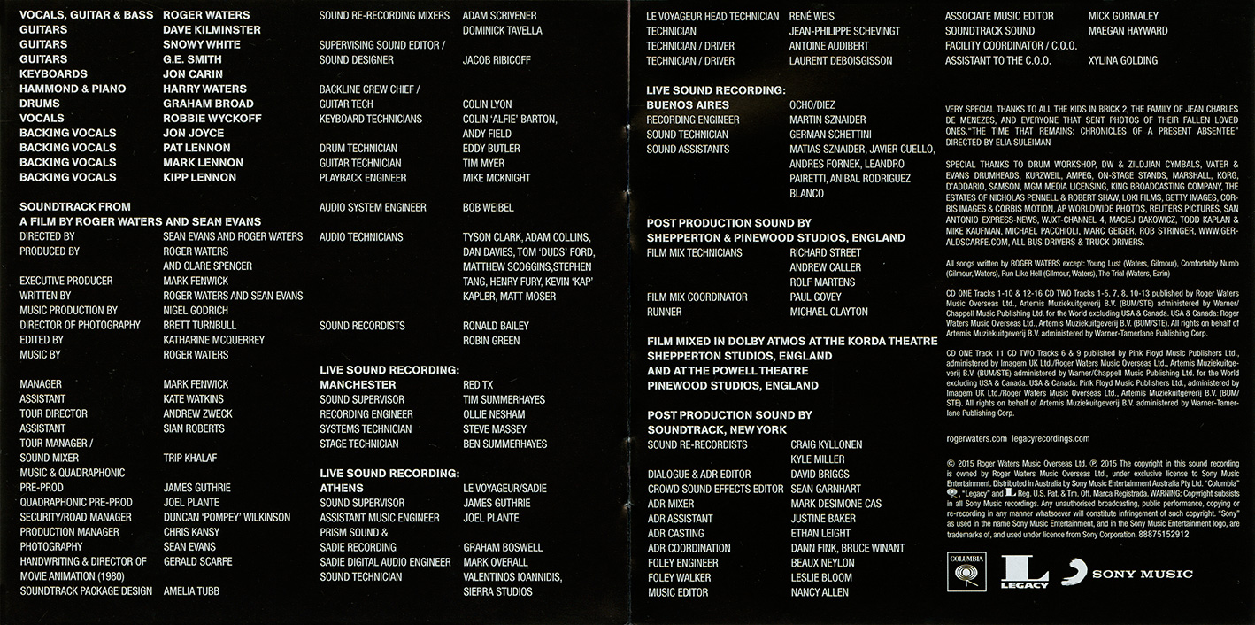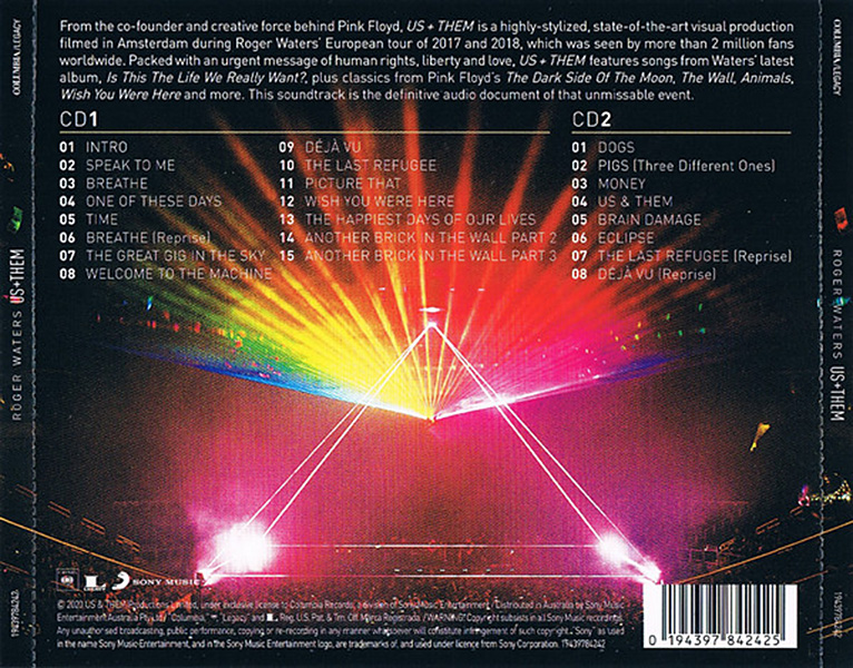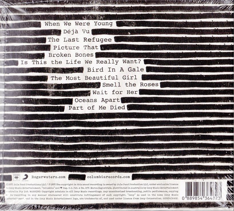 Back Cover: A picture of Roger Waters. Song titles. Bar code. "Manufactured in Australia by Sony Music Entertainment (Australia) Limited."