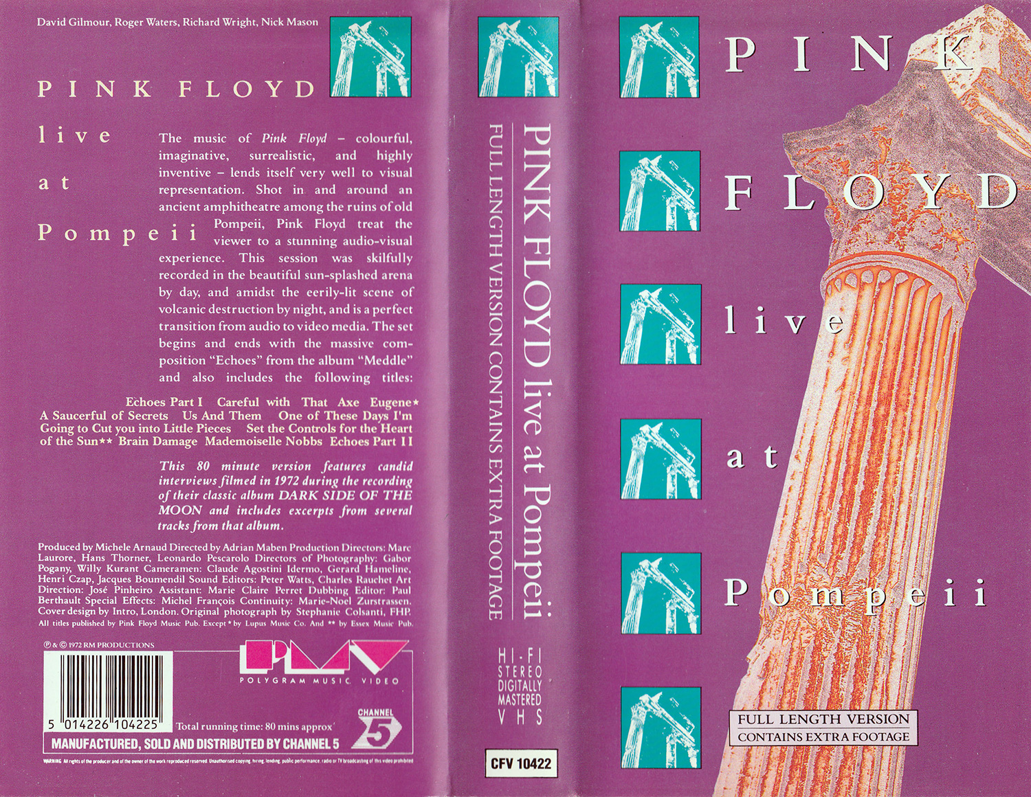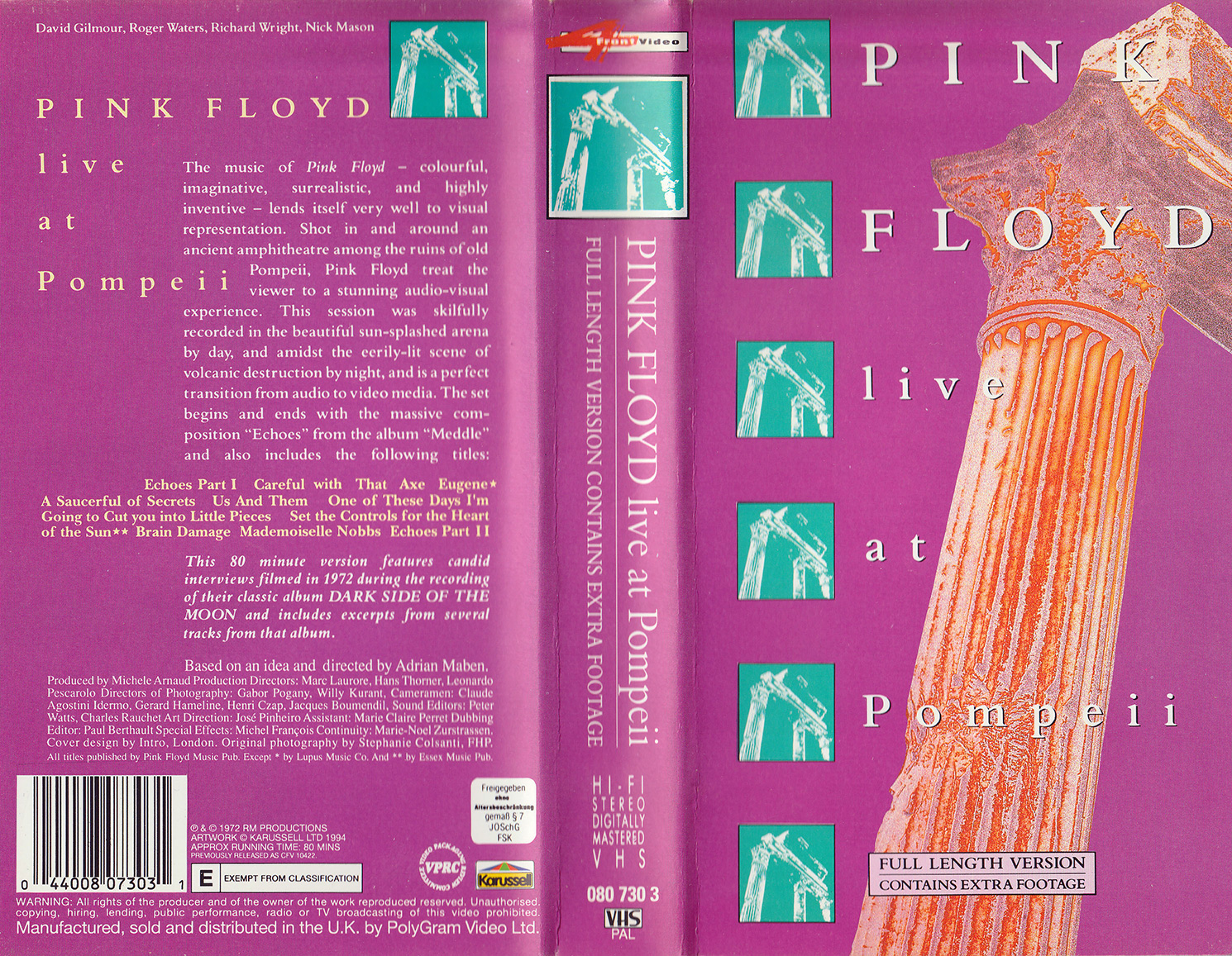 Release Information: A video shot in the ruins of Pompeii. Songs include Echoes (Part 1), Careful With That Axe Eugene, A Saucerful of Secrets, One of These Days I'm Going to Cut You Into Little Pieces, Set the Controls for the Heart of the Sun, Mademoiselle Nobs, Echoes (Part 2).