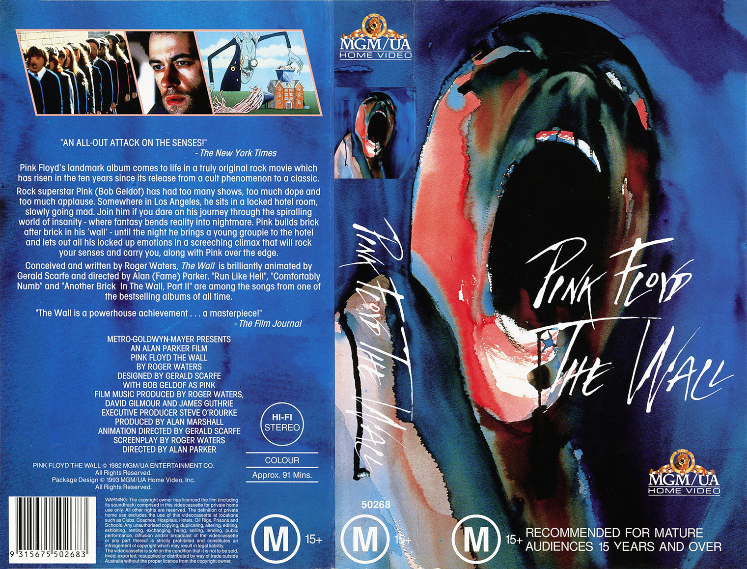 Video Information: An Alan Parker film. The Wall by Roger Waters. Designed by Gerald Scarfe. With Bob Geldof as Pink. Film Music produced by Roger Waters, David Gilmour. Executive producer Steve O'Rourke. Produced by Alan Marshall. Animation directed by Gerald Scarfe. Screenplay by Roger Waters. Directed by Alan Parker.