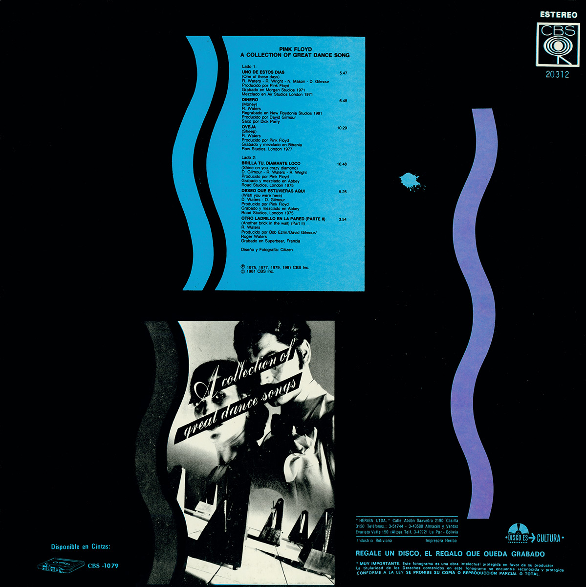 Back Cover: Black with the song list on a blue background. The album title is listed as "A Collection of Great Dance Song." In the top right corner is ESTEREO, the CBS-logo, and the catalog-number. In the lower left corner is: Disponible en Cintas and the catalog-number CBS-1079. At the bottom, its says: "HERIBA LTDA. Calle Abd n Saavedra 2190 Casilla 3120 Tel fonos.: 3-51744 - 3-43580 Almac n y Ventas Evaristo Valle 150 (Altos) Telf. 3-4221 La Paz Bolivia Industria Boliviana Impresora Heriba." Laminated.