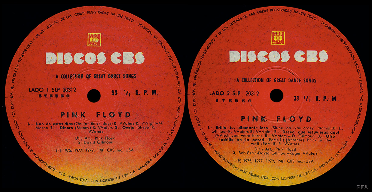 Spine: CBS 20312 PINK FLOYD A COLLECTION OF GREAT DANCE SONGS