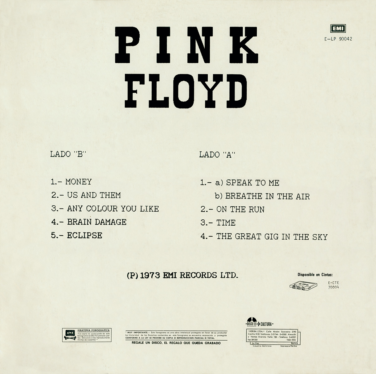 in big black letters is "PINK FLOYD" and the catalog-number. At the bottom is: (P) 1973 EMI RECORDS LTD. Disponible en Cintas, and the catalog-number E-CTE 70004. Laminated.