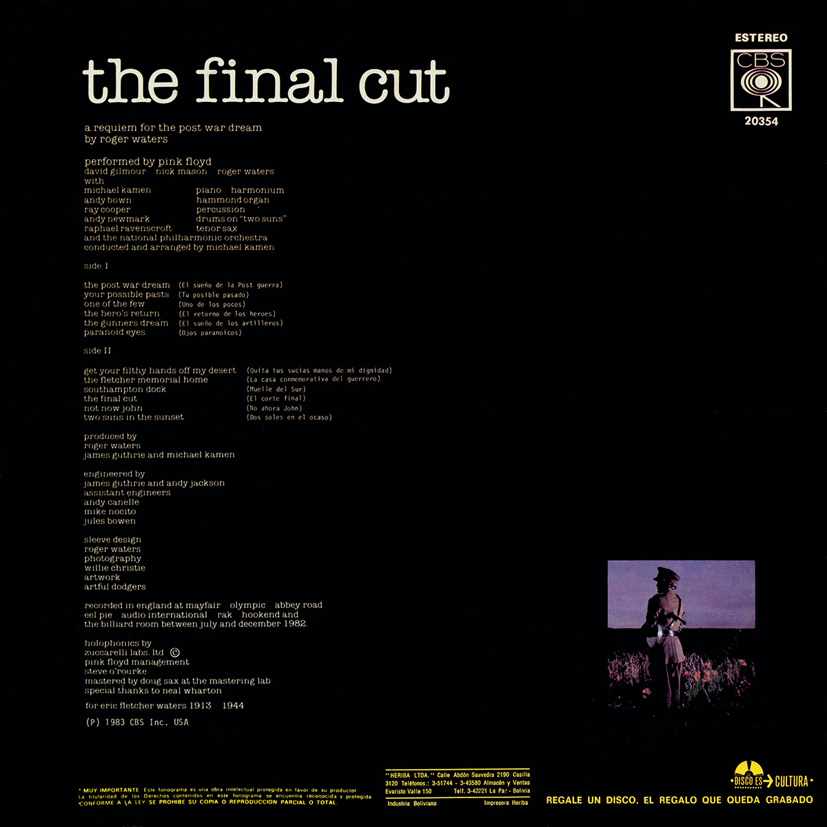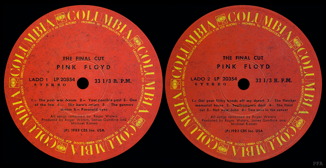 Front Cover: Black with military stripes, and "pink floyd the final cut" in big white letters in the middle. In the top right corner is ESTEREO, the CBS-logo and catalog-number. Laminated.
