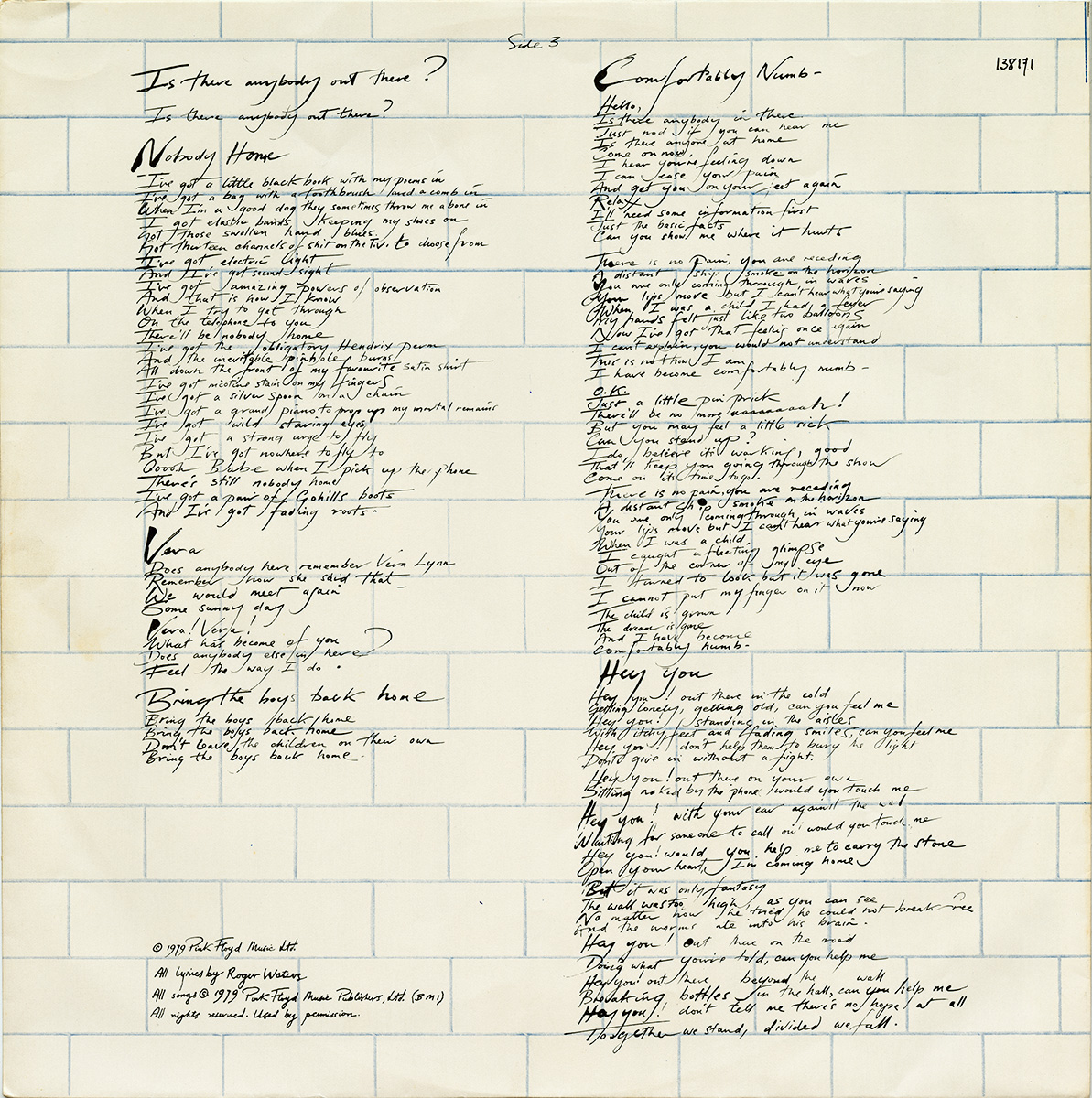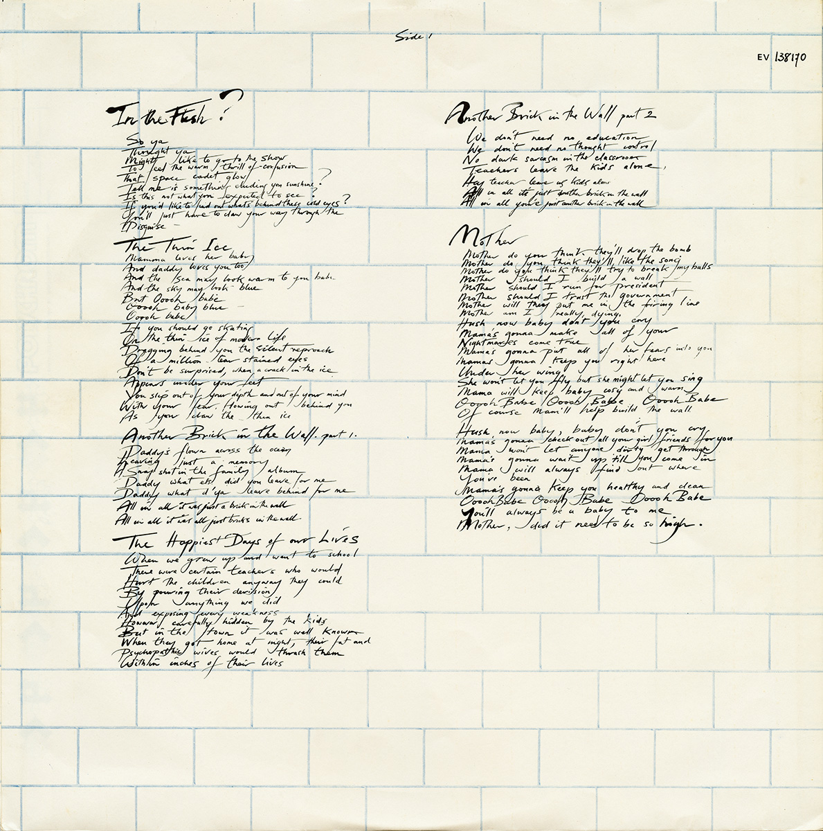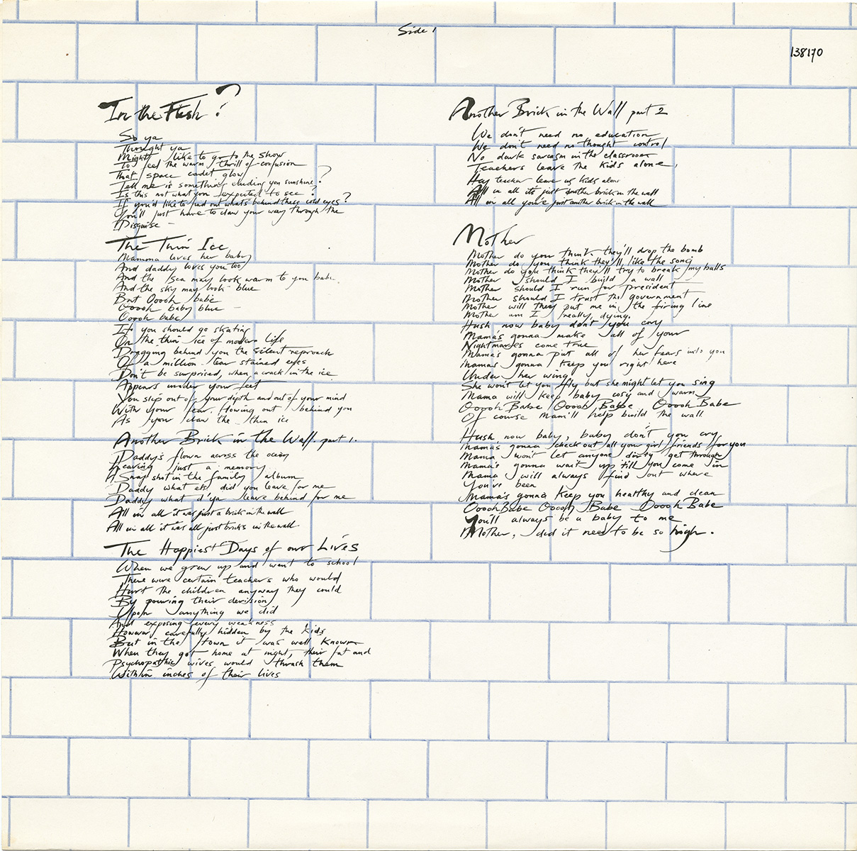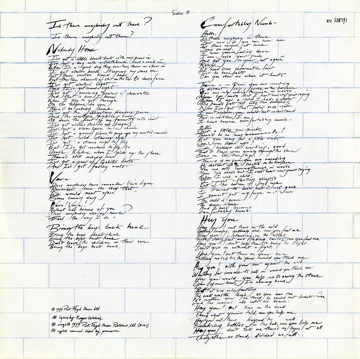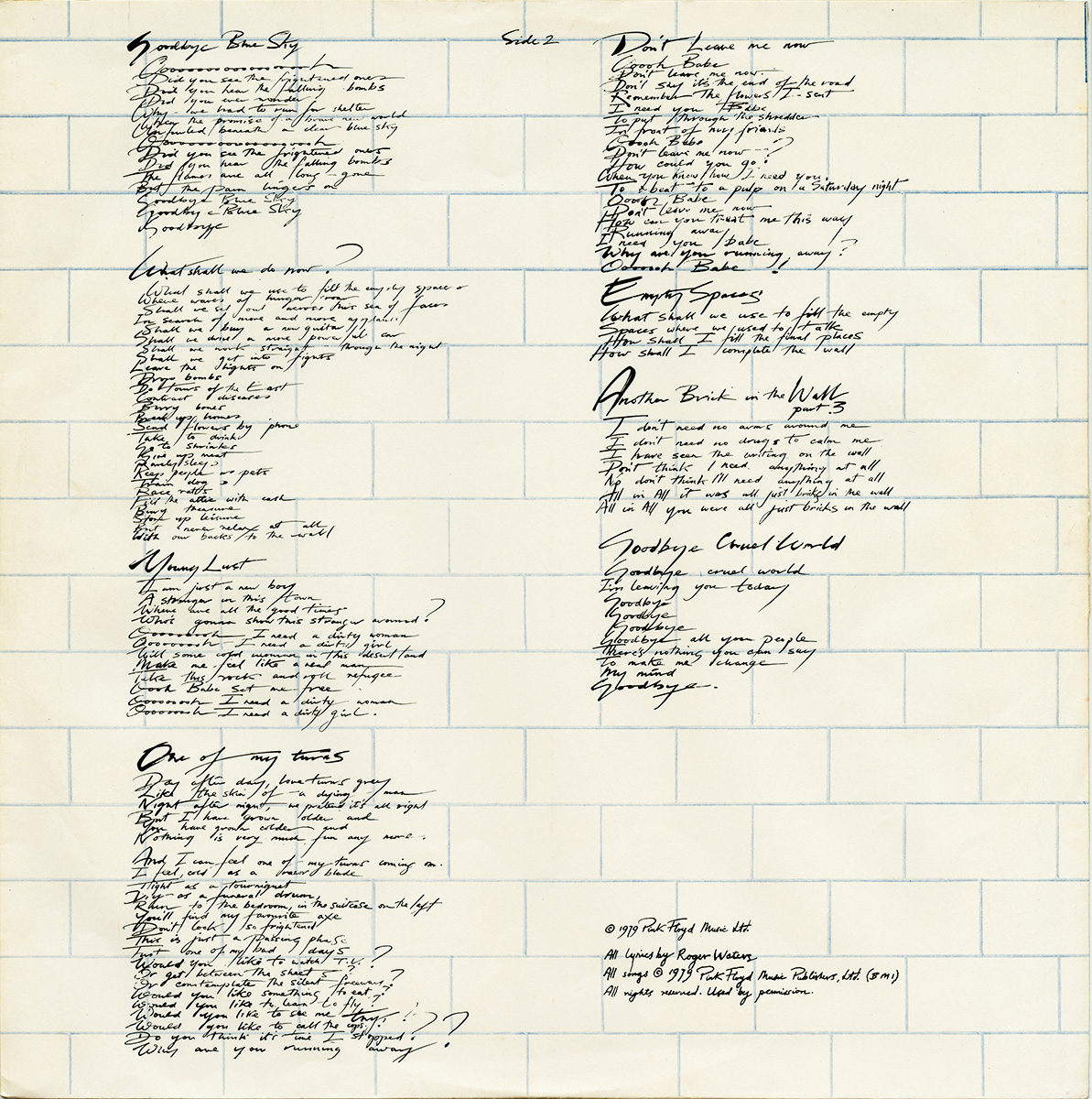 Inner Sleeves: [1 - front] [1 - back] [2 - front] [2 - back] White brick wall with lyrics.