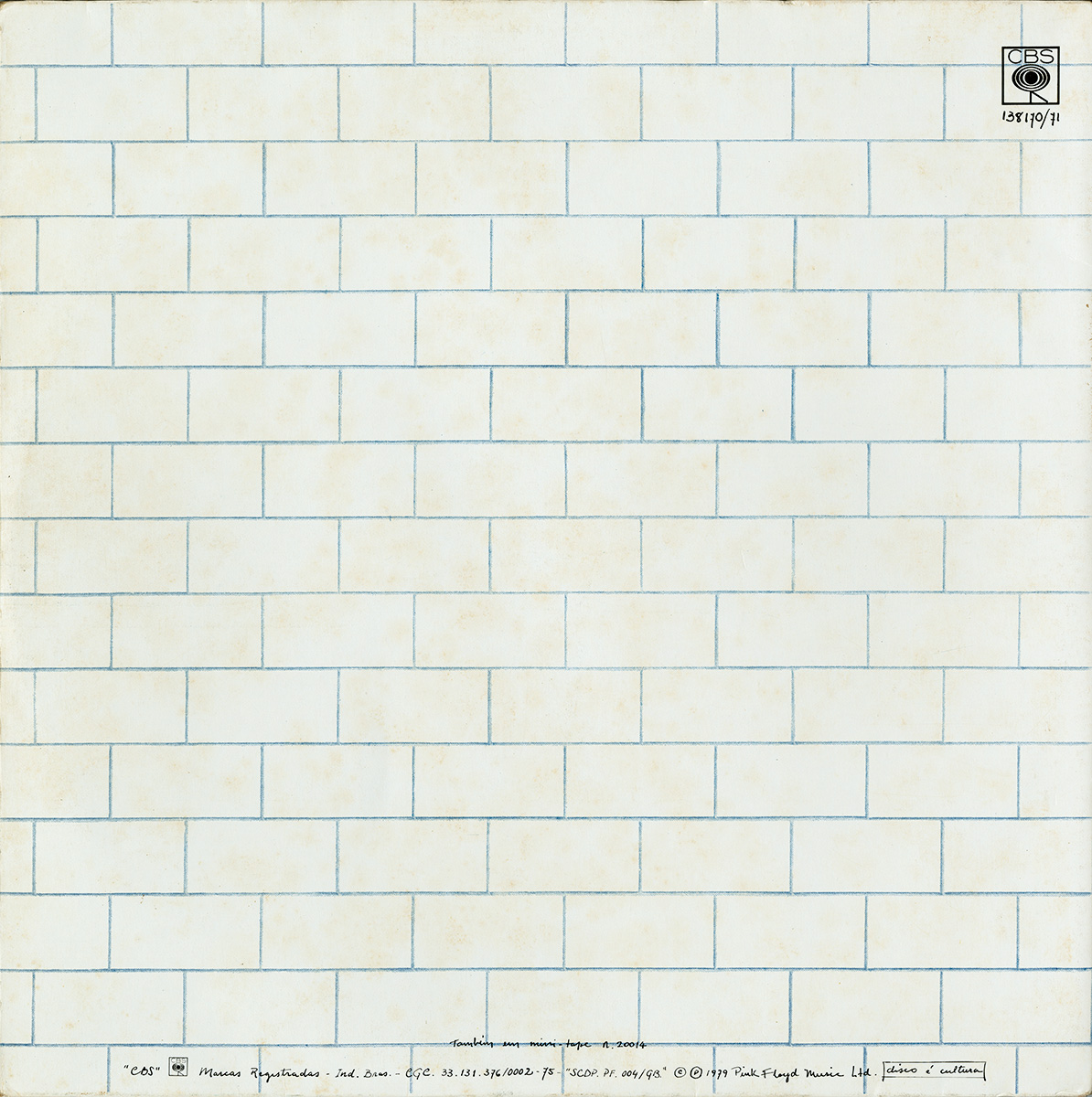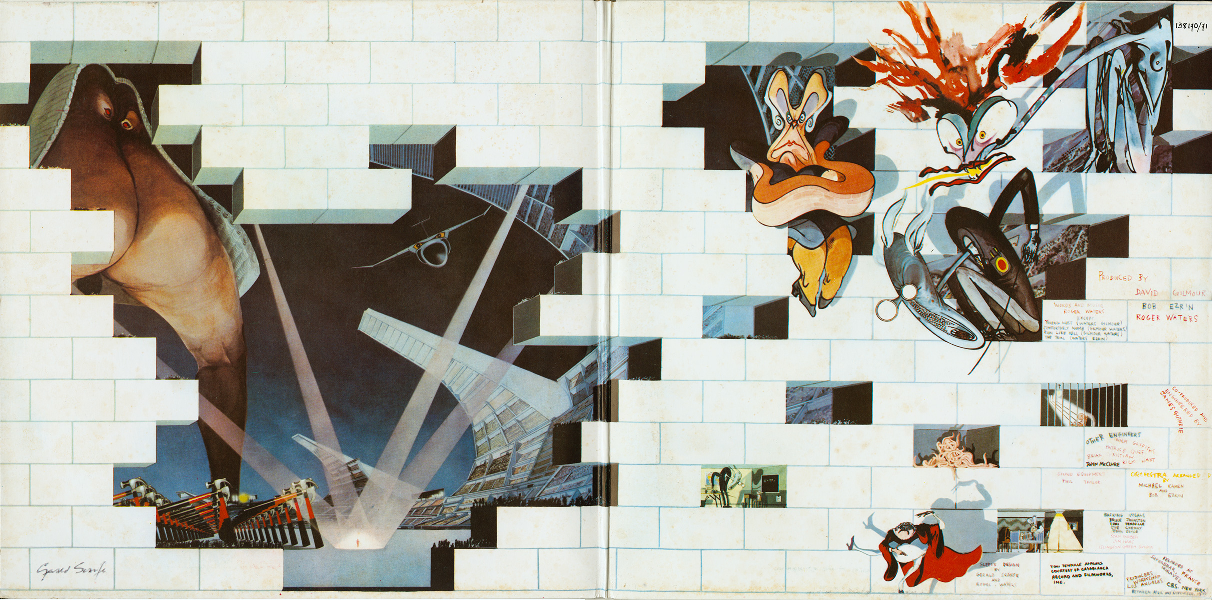 Inside Cover: White brick wall with Scarfe characters. Credits.