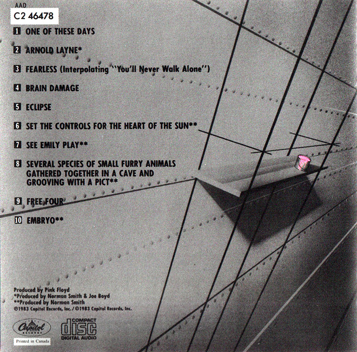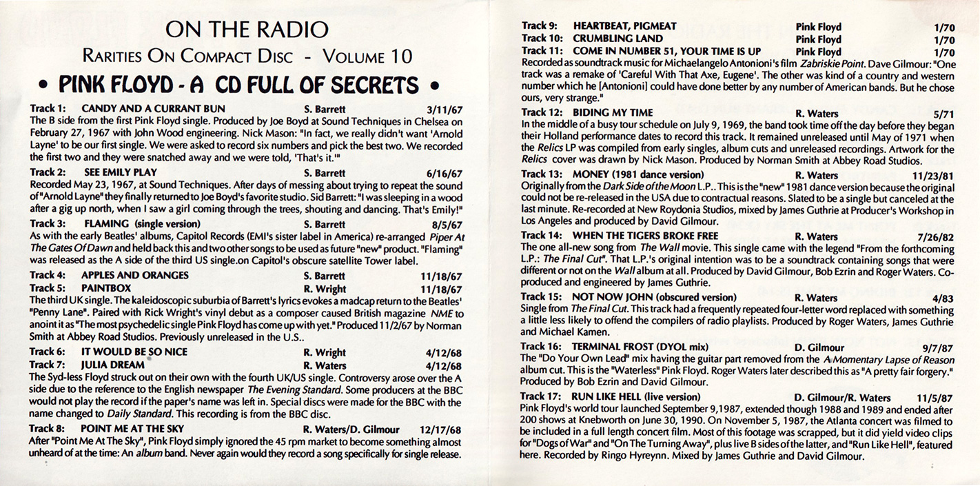 Songs: Candy and a Current Bun, See Emily Play, Flaming (single version), Apples and Oranges, Paintbox, It Would Be So Nice, Julia Dream, Point Me at the Sky, Heartbeat, Pigmeat, Crumbling Land, Come In Number 51, Your Time Is Up, Biding My Time, Money (1981 dance version), When the Tigers Broke Free, Not Now John (obscured version), Terminal Frost (DYOL mix), and Run Like Hell (live version).