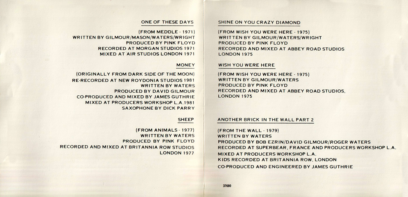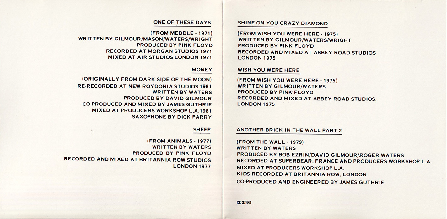 Disc 1 - Astronomy Domine, See Emily Play, The Happiest Days of Our Lives, Another Brick in the Wall, part 2, Echoes, Hey You, Marooned, The Great Gig in the Sky, Set the Controls for the Heart of the Sun, Money, Keep Talking, Sheep, Sorrow.