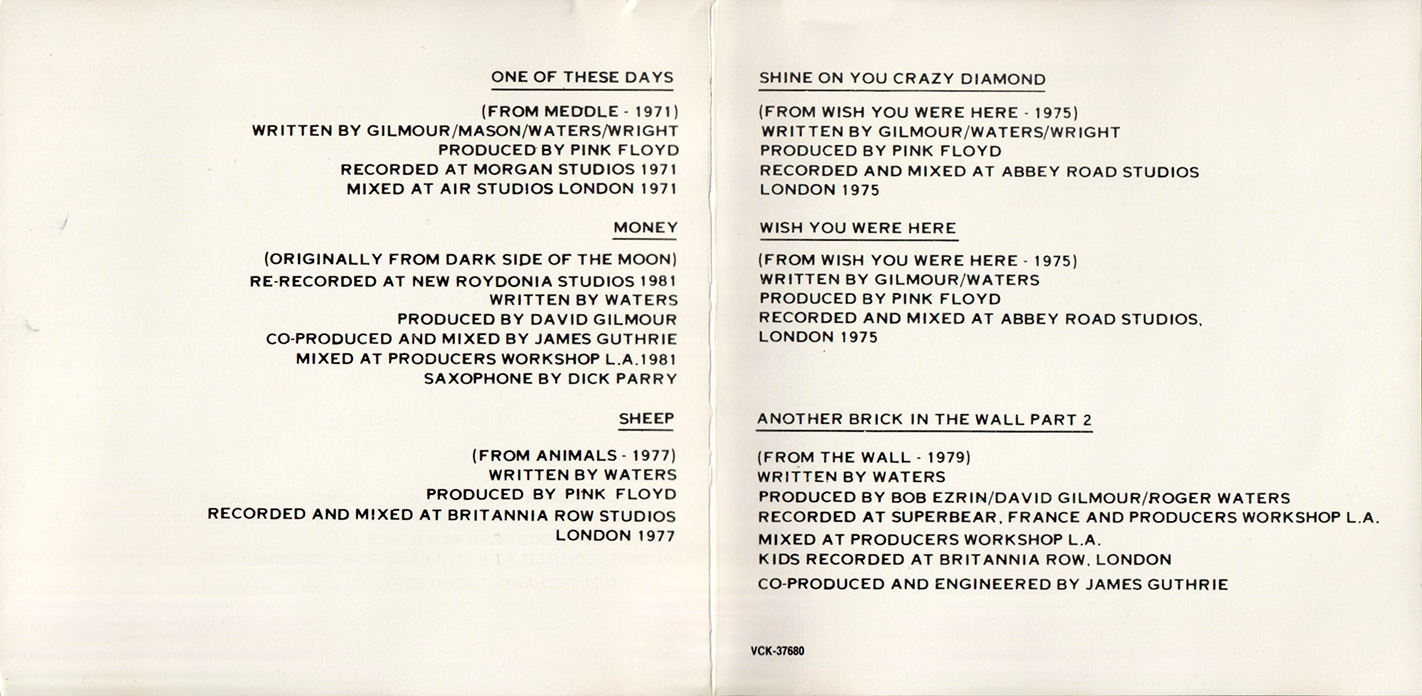 Slip Case: Title and images from past Pink Floyd albums. Back has song lisitng and bar code.