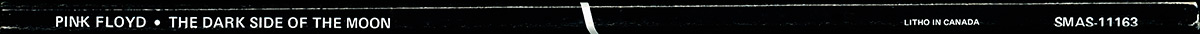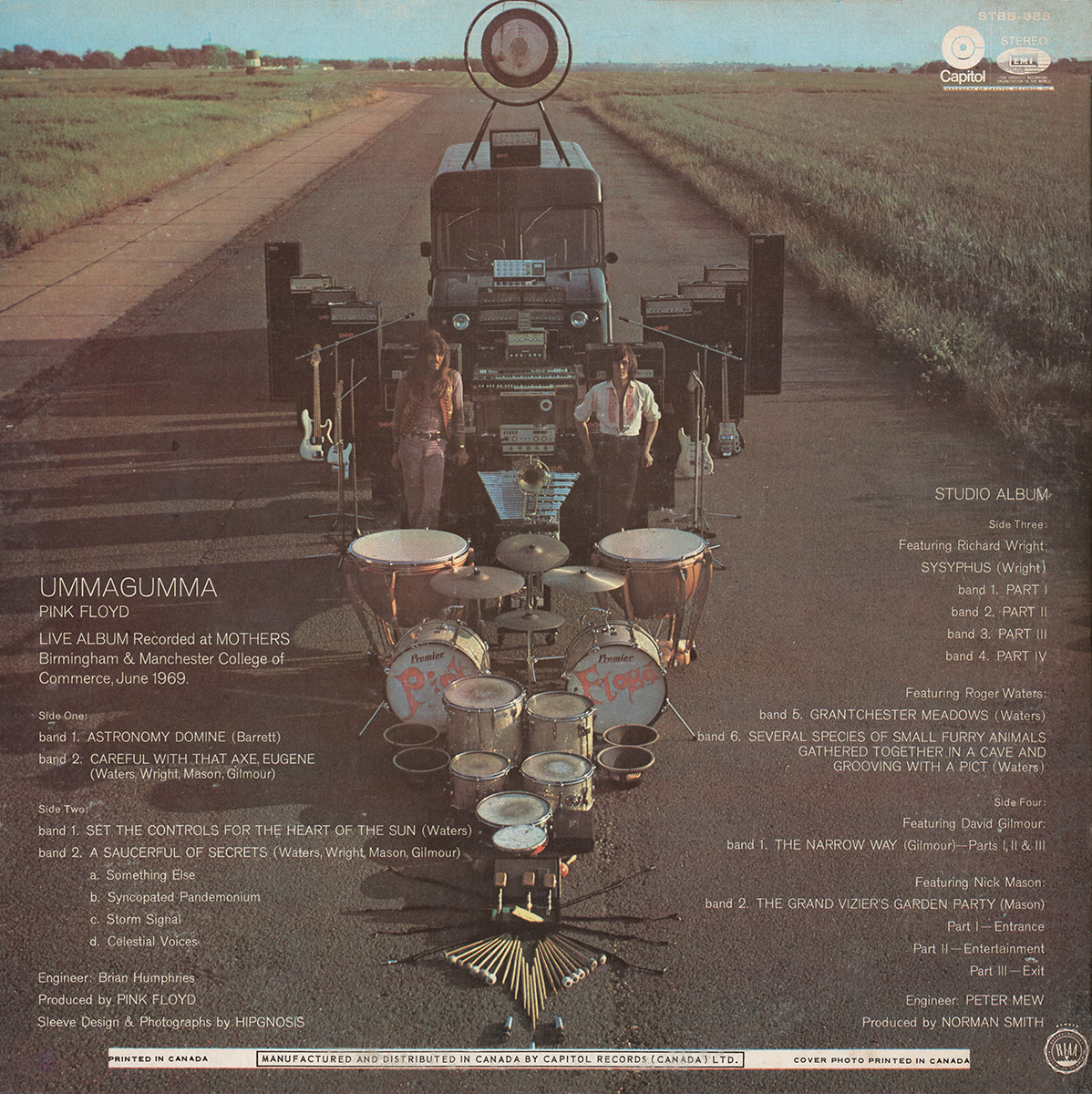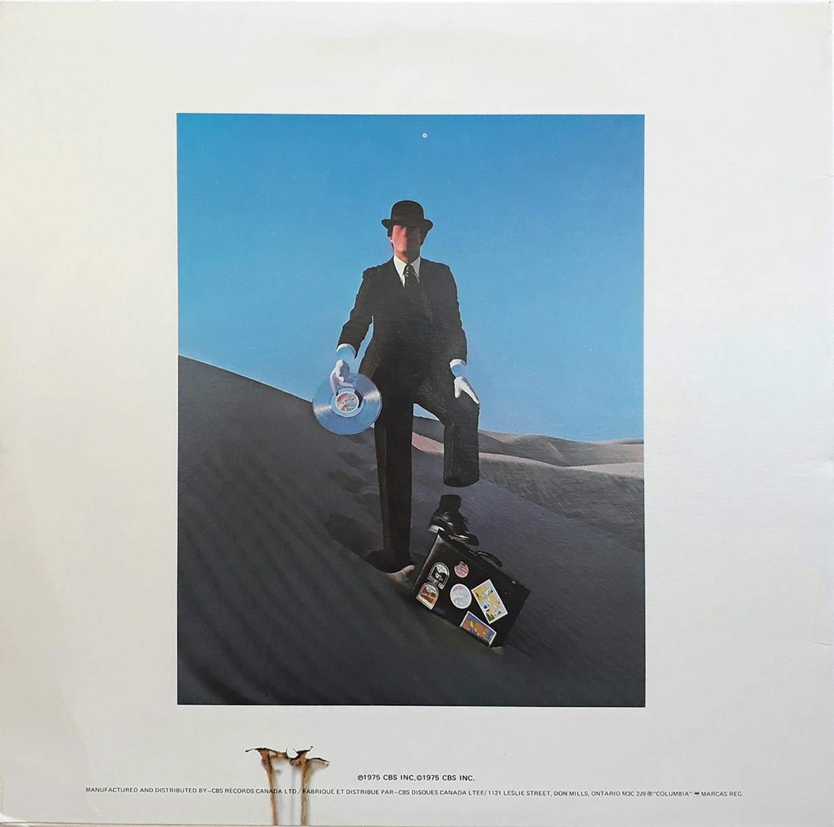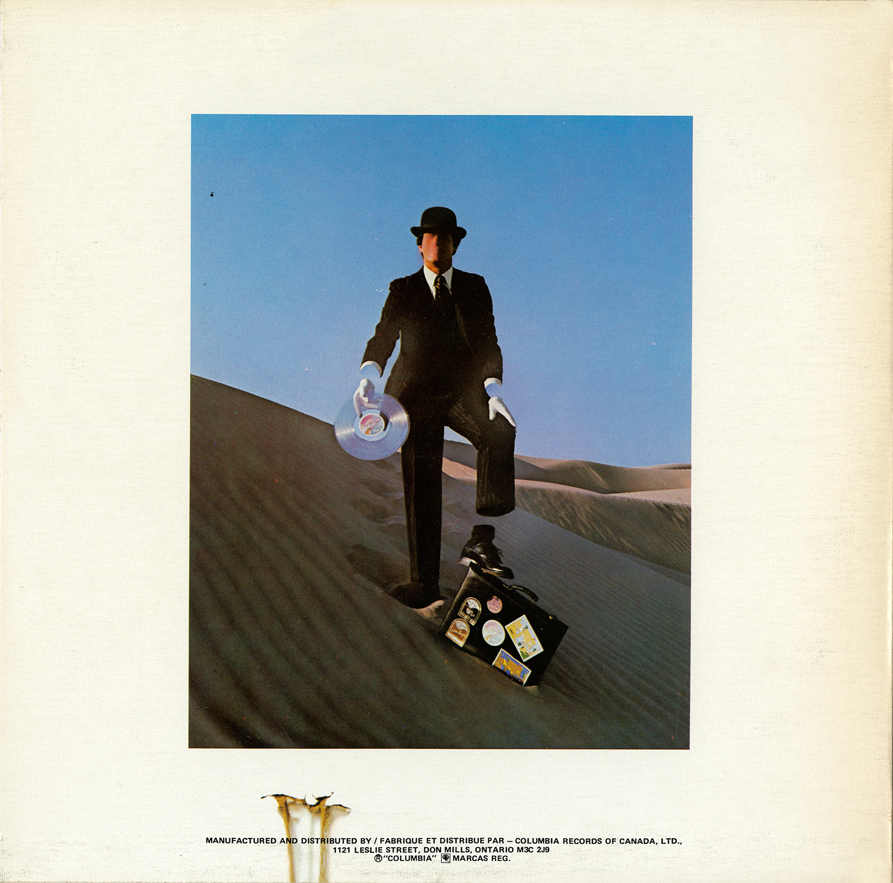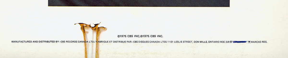Back Cover: Song listing. Credits. On the top left seam is a small black circle that is divided into two halves, indicating that this is a stereo release (this circle is centered on the top spine of the album cover, and, if the cover slick is centered properly, the tips of the circle are visible on both the front and back covers). In the bottom right, it says: Manufactured by Capitol Records (Canada) Ltd.