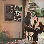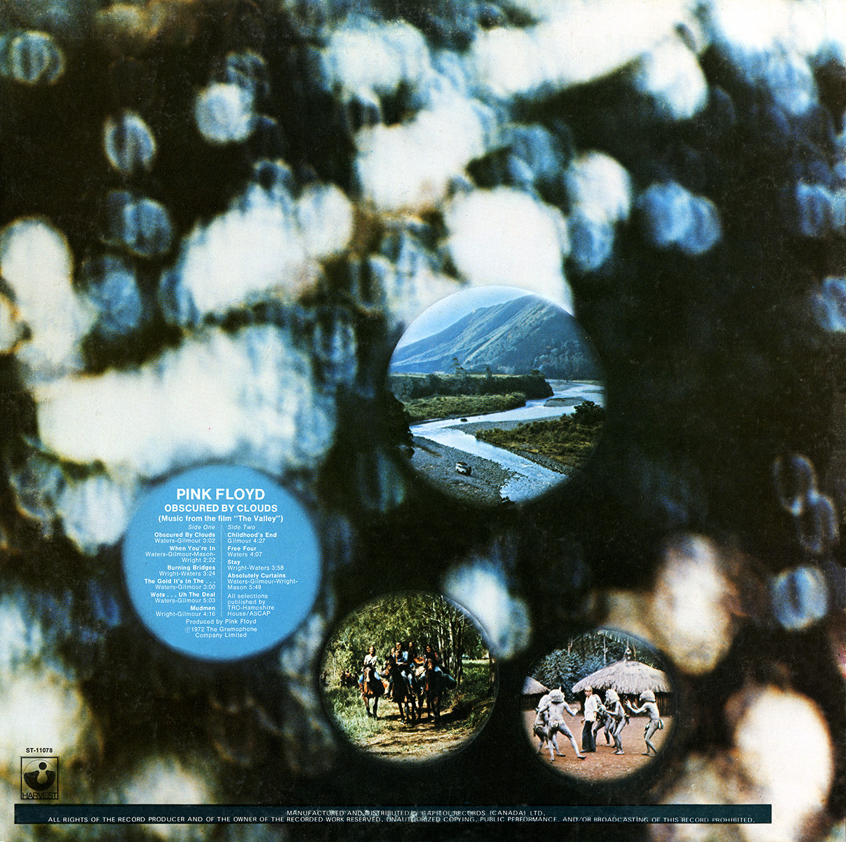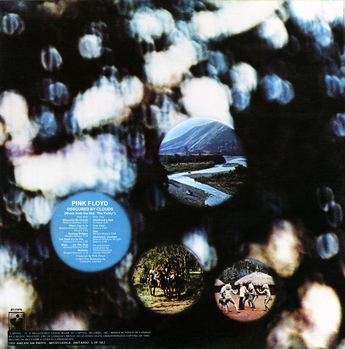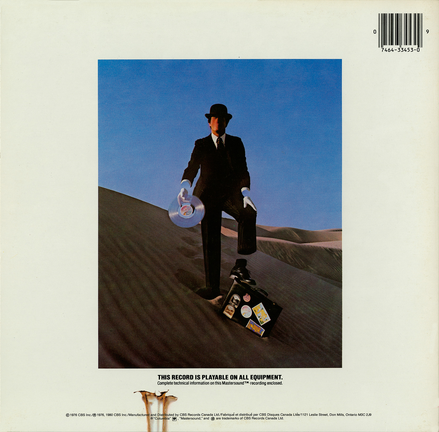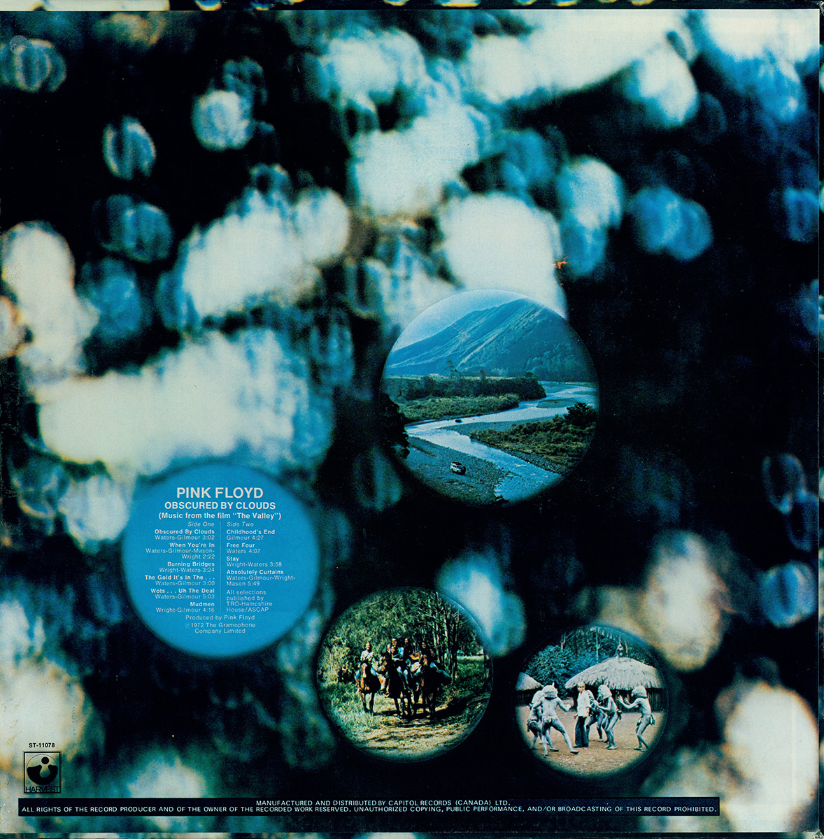 Back Cover: Song listing. Credits. On the top left seam is a small black circle that is divided into two halves, indicating that this is a stereo release (this circle is centered on the top spine of the album cover, and, if the cover slick is centered properly, the tips of the circle are visible on both the front and back covers). In the bottom right, it says: Manufactured by Capitol Records (Canada) Ltd.