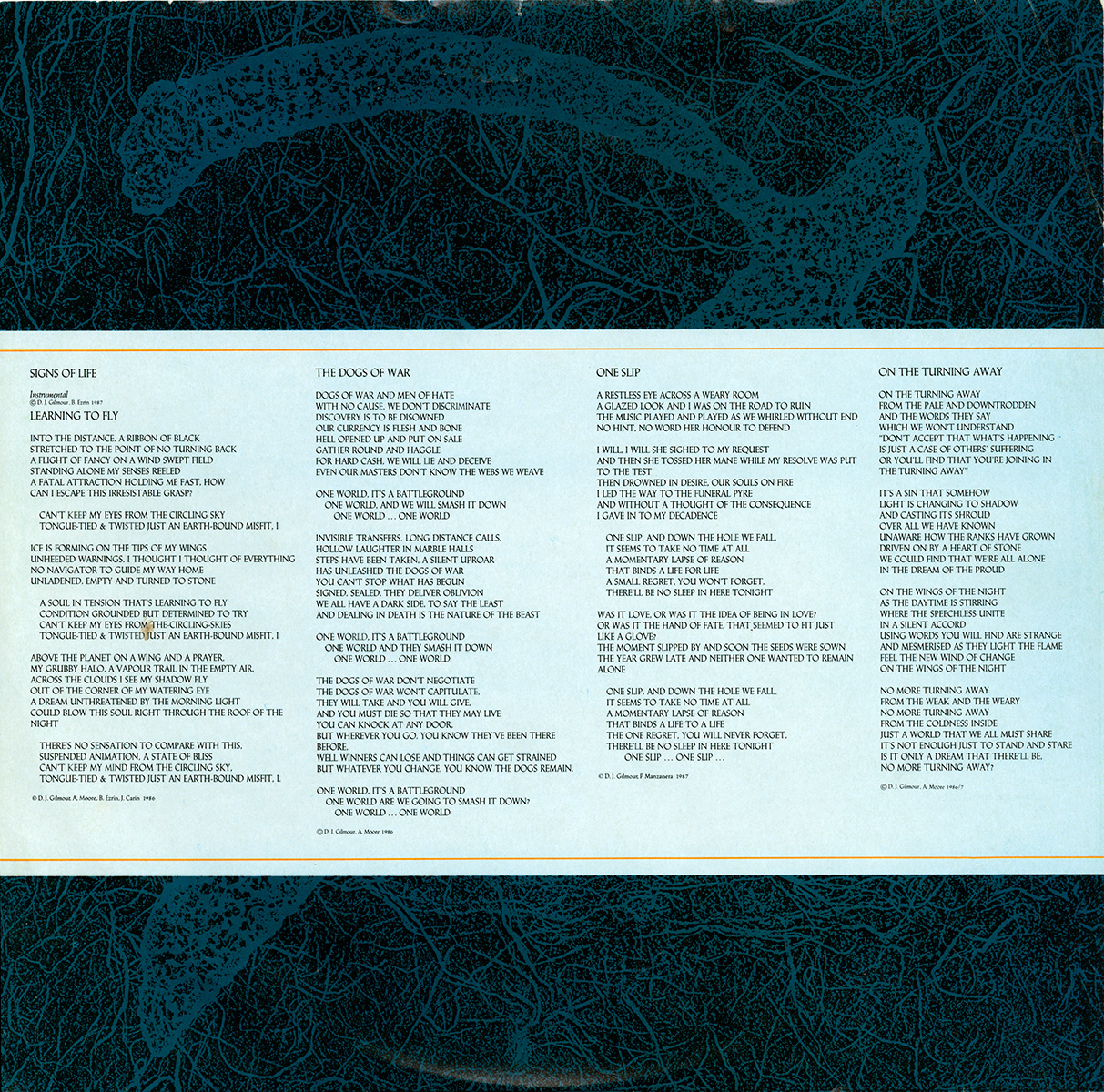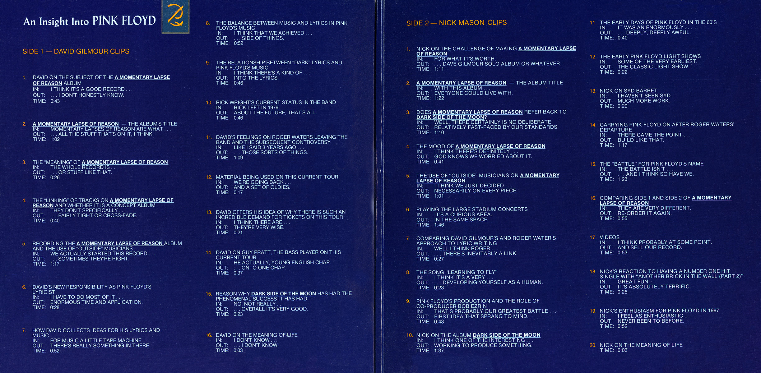 Release Information: Double album. Promo only release. The first record is: Conversational clips with David Gilmour and Nick Mason. The second record is: A Momentary Lapse of Reason.