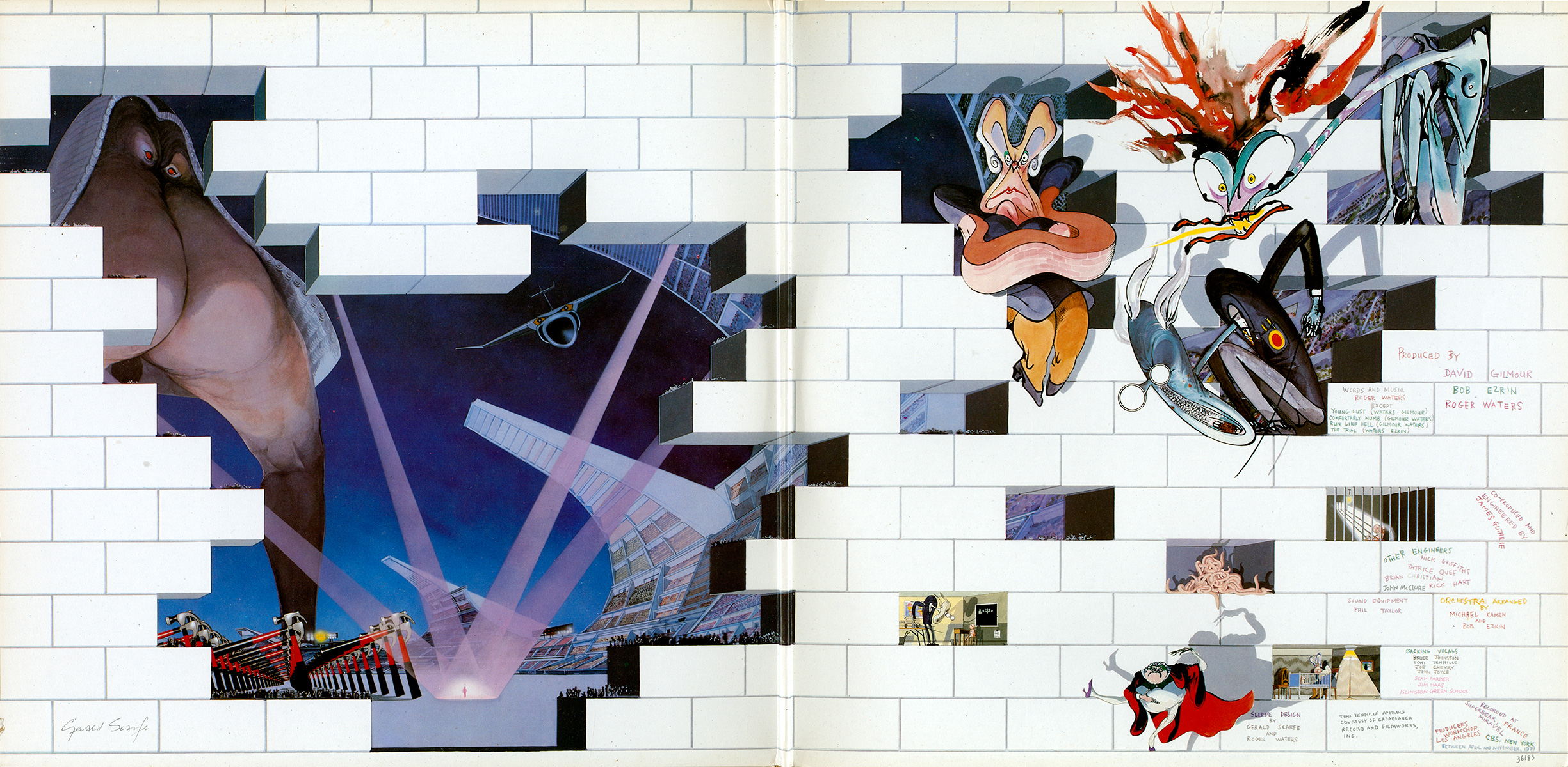 Inside Cover: White brick wall. Scarfe drawings. Credits.