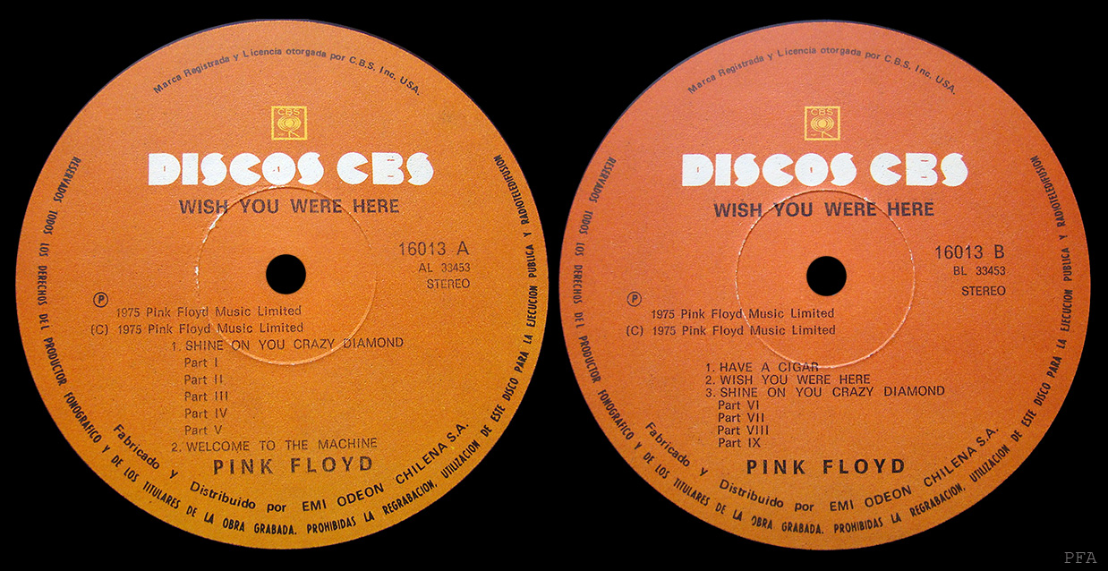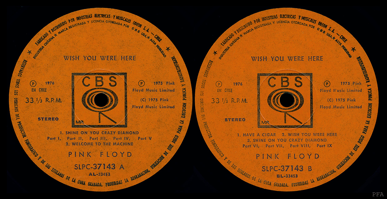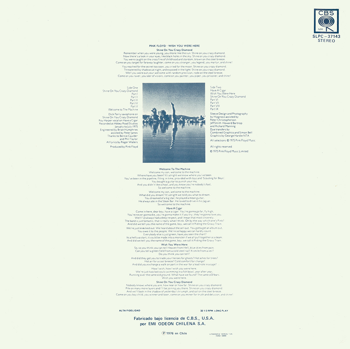 Cover Sticker: Issued with a large round sticker that features a mechanical handshake, the four elements, and the words "Pink Floyd Wish You Were Here. " Around the edge of the sticker it says "Shine On You Crazy Diamond - Welcome to the Machine - Have a Cigar - Wish You Were Here, SLPC-37143, P (c) 1975 Pink Floyd Music Limited, Fabricado bajo Licencia de CBS. USA. por EMI ODEON CHILENA S.A. Santiago-Chile. "