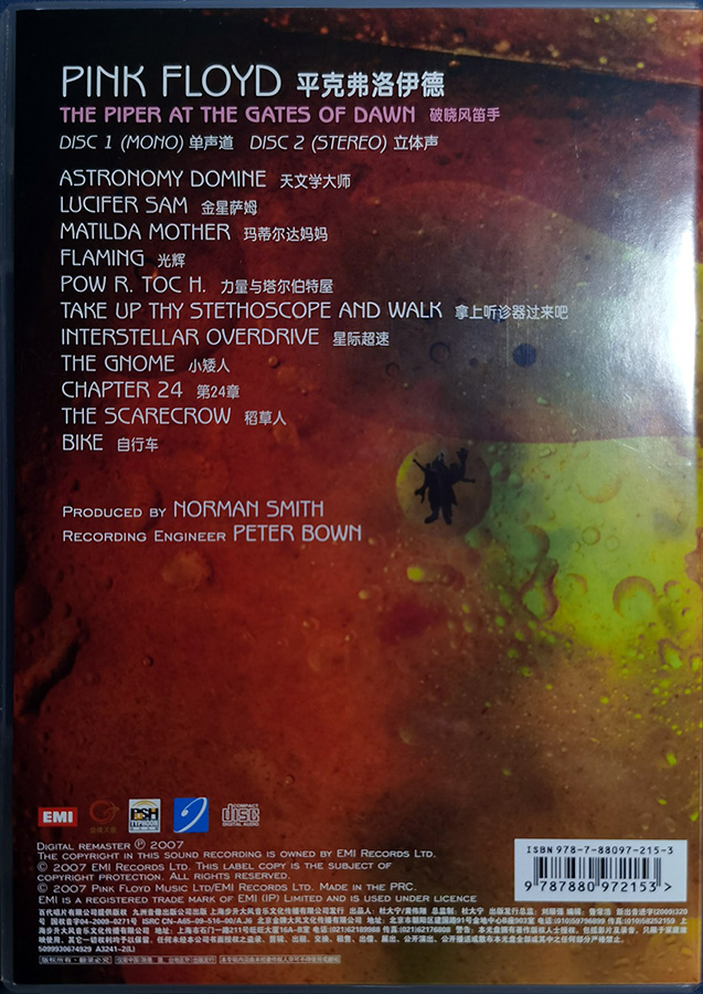Back Cover: In the upper right corner is the catalog number, the ISBN, and the bar code. Underneath it says "I: 070, F: PM 520, CDEMD 1064, Printed in P.R.C., Place of manufacture as stated on label. Marketed and distributed by EMI."