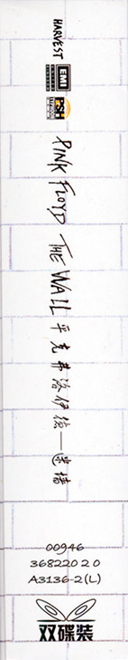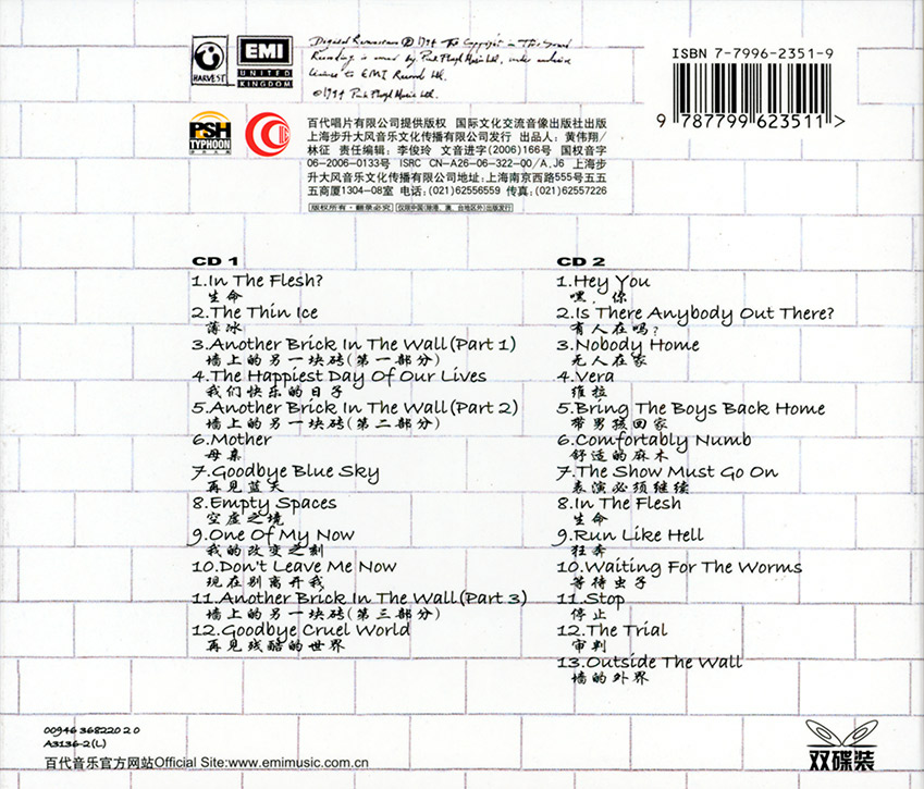 Back Cover: White brick wall sing titles in the center. In the bottom left corner is the word "Sony" followed by Chinese text. Below this is the ISRC number. In the bottom right corner it says "© 1979 Pink Floyd Music Limited / Columbia is the exclusive trademark of Sony Music Entertainment Inc. / Distribution Sony Music. WARNING: All Rights Reserved. Unauthorized duplication is a violation of applicable laws."