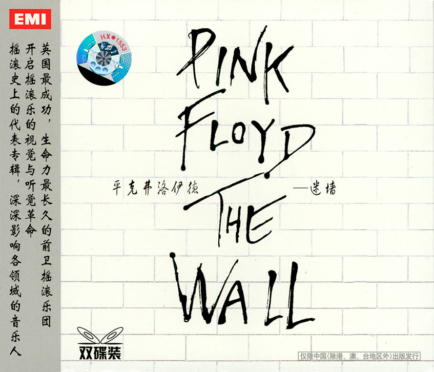 Slip Case Front: Cardboard slip case with disc inserted from the top. White brick wall with title. Chinese text down the left side in a grey strip. EMI logo in upper left corner.