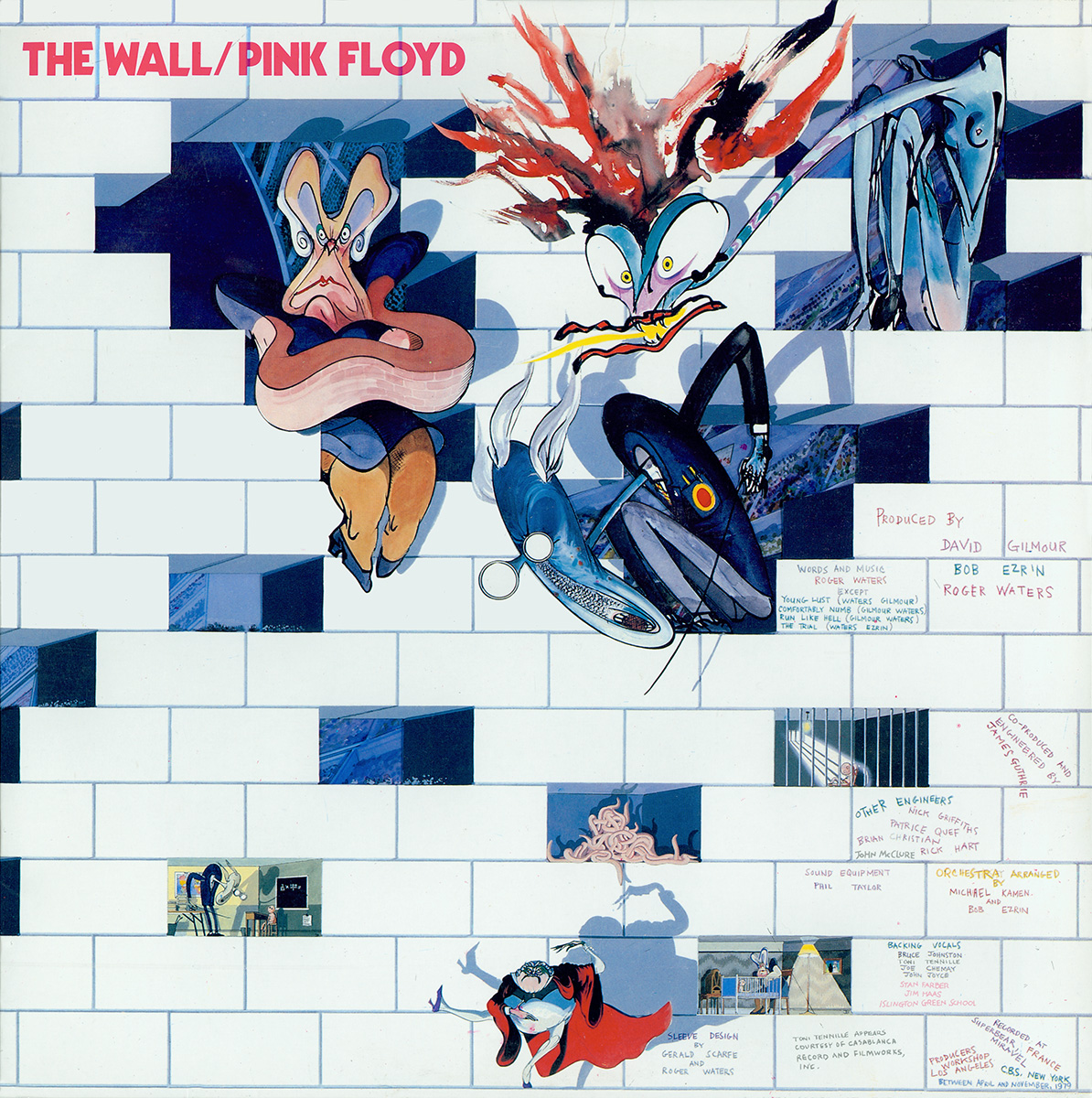 Cover: The Wall with Gerald Scarfe drawings and credits. Title in upper left corner in pink.