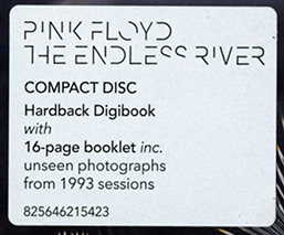 Cover Sticker: Rectangular white cover sticker that says "PINK FLOYD THE ENDLESS RIVER Compact Disc Hardback Digibook with 16-page booklet inc. unseen photographs from 1993 sessions 82564621334"