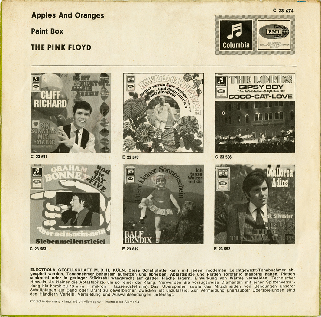 Back Cover #1: Song titles. Credits. Pictures of six other Columbia artists/singles (same ones as used on the Arnold Layne back cover). Printed in Germany.