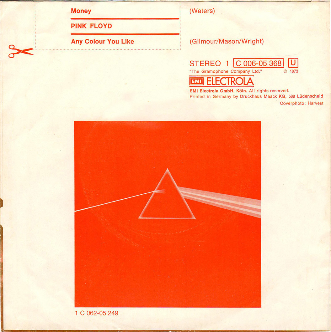 Front Cover: White with a group-photo in brown colours. At the top in red letters it says: MONEY. In green letters is: ANY COLOUR YOU LIKE. In red letters: Pink Floyd. In the upper left corner is the EMI/Electrola-logo, number 1C 006-05 368.