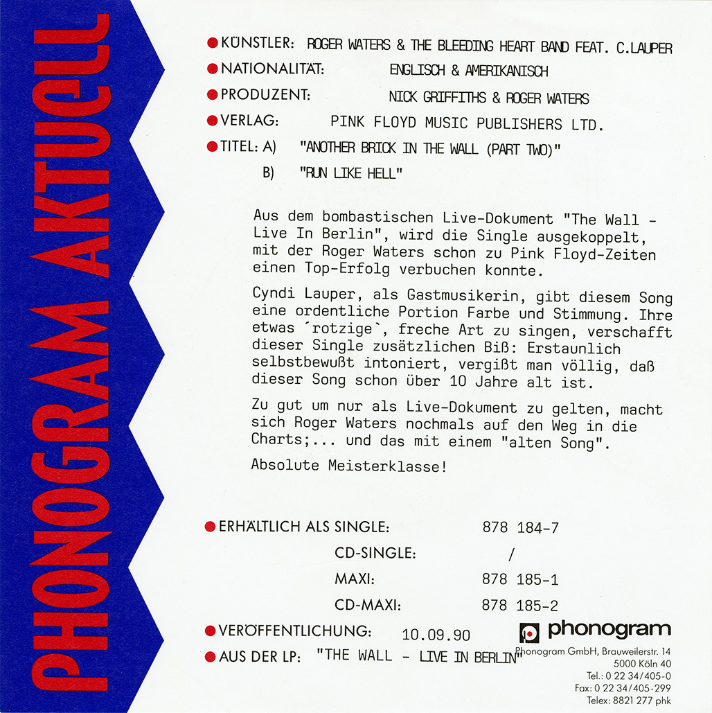 Release Information: German issue of songs recorded live at the Wall-Live in Berlin concert.