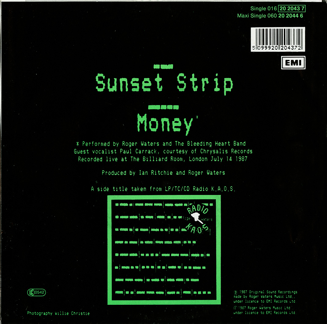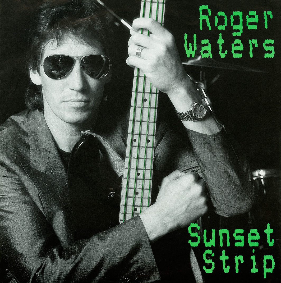 Front Cover: Black and white photo of Roger Waters holding his guitar. In the lower right corner are the words: Sunset Strip.