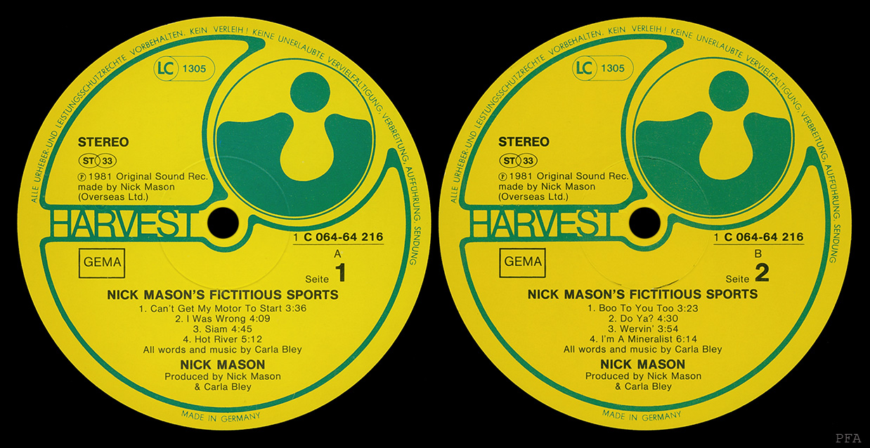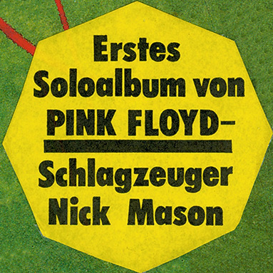 Front Cover: Glossy. Picture of a fictitious playing field. In the lower right corner is a sticker that reads: Erstes Soloalbum von PINK FLOYD-Schlagzeuger Nick Mason.